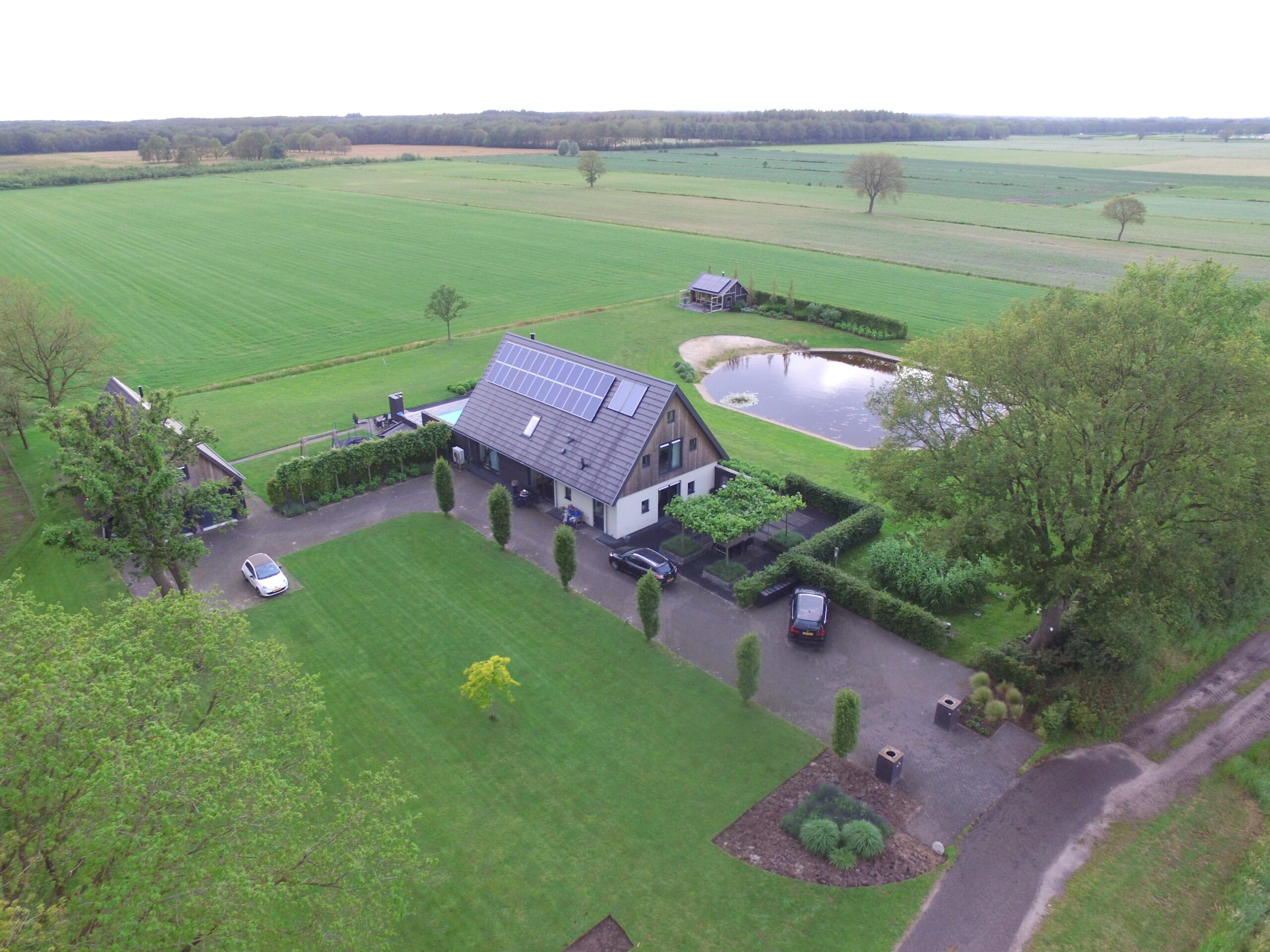Op de plek 10.000 m2 waar dit nieuwe huis is gebouwd, stond een oude verwaarloosde boerderij met schuren.De grond was vervuild met asbest en resten olie.Wij hebben de boerderij met de lusten en lasten gekocht van de erfen.De boerderij en de schuren zijn gesloopt en de grond is ,op plekken waar de vervuiling zat, afgegraven en er is nieuwe grond opgebracht.Vrijstaand huis in 2013 gebouwd , inhoud huis is ongeveer 775 m3.