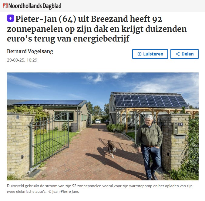 Welkom in de woning van Pieter Jan en Rina. Ons motto is, techniek hoor je niet, zie je niet, het is er gewoon. Wij hebben een bijzonder comfortabele woning die voorzien is van alle denkbare luxe en staat in een prachtige landelijke omgeving.Onze woning is in 2011 gebouwd en was toen de eerste energie neutrale woning in Hollands Kroon. Op zaterdag 26 oktober 2013 hebben we tijdens de eerste Duurzame huizen route hiervoor een mooie erkenning gekregen. Sindsdien zijn er 1000de mensen bij ons langs geweest. Nieuwsgierigen uit de buurt, doe-het-zelvers uit de omgeving en gelijkgestemden uit het hele land. Sinds februari 2020 is het een gasloze, energieleverende woning, die zelfs genoeg energie levert voor onze 2 elektrische auto’s. We hebben zelfs veel elektra over! In 2024 is dat ca 30.000 kwh over!Sinds September 2021 is de woning voorzien van een eigen gelijkstroom netwerk, zodat we klaar zijn voor een batterij en koppeling aan de buren en koppeling aan onze windmolen. zie: https://www.nhnieuws.nl/nieuws/313803/is-stroom-delen-met-je-buren-een-… stroom delen met je buren een oplossing voor het overvolle elektriciteitsnetwerk? – NH Nieuws We hebben nu ook een bijna passief kantoor gebouwd in de schuur (met warmtepomp / wtw /co2 geregeld / vacuümglas etc)We blijven doorgaan tot we dag en nacht onze eigen energie op kunnen weken, op kunnen slaan en kunnen delen met anderen.Ook onze tuin proberen we zo in te richten dat we er zoveel mogelijk uit kunnen gaan eten.