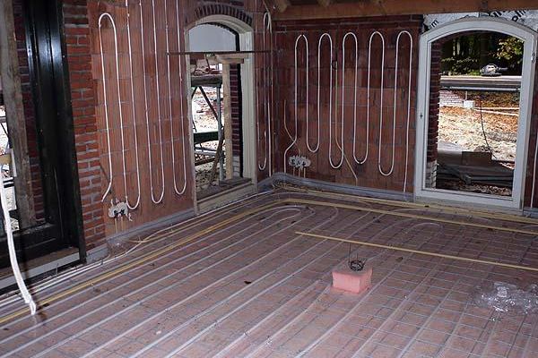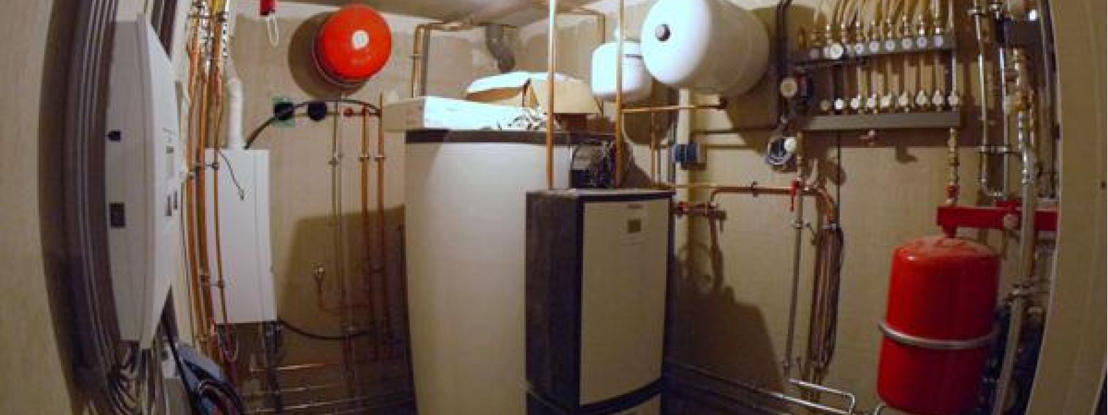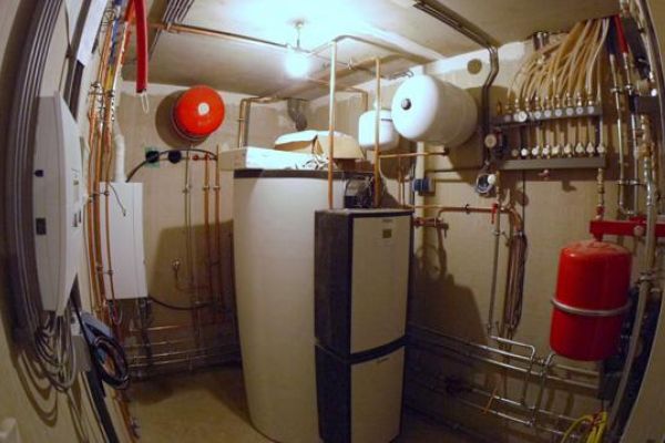 Verwarming door leemkachel met warmtewisselaars, zonneboiler en cv ketel. Warm water wordt opgeslagen in een buffervat van 800 ltr Vaillant Allstor.