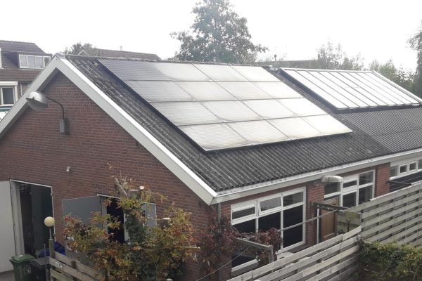 Woning is een voormalige werkplaats. Lichtstraat in het dak. 32 zonnepanelen. Geen gas. Warmtepomp. Pelletkachel.