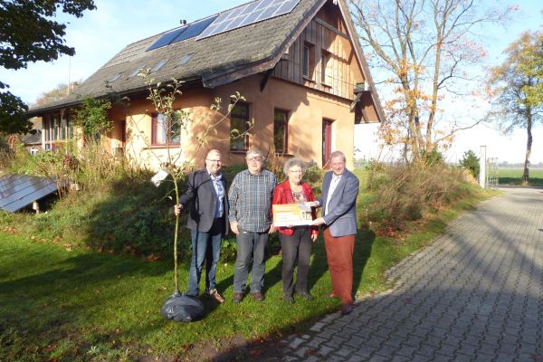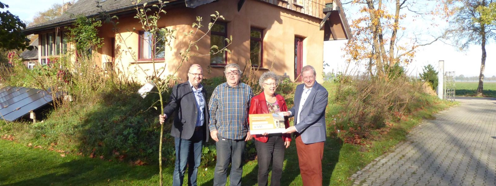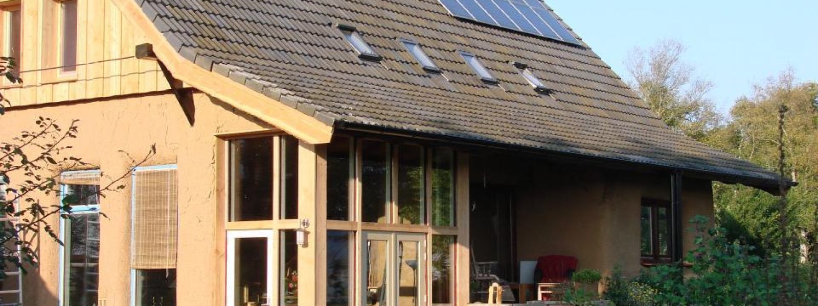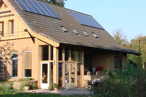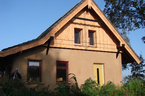 Winnaar publieksprijs duurzaamste huis van Drenthe 2018 >Woning met muren opgebouwd uit strobalen en binnen en buiten afgewerkt met leem. De constructie die het dak draagt, bestaat uit op maat gemaakte oude eikenhouten gebinten. Verwarming door middel van een houtkachel (met warmtewisselaar) en lage temperatuur vloerverwarming via warmtewisselaar in warmwaterboiler. De beglazing is voor het merendeel drielaags. Verder is de woning off-grid en er is geen aansluiting op het elektriciteitsnet. Stroom wordt geleverd door 26 zonnepanelen en opgeslagen in accu’s.