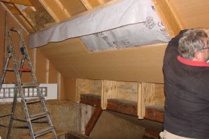 Dakisolatie in 2011. Toelichting: homatherm celluloseplaten 35 en 22 mm, daartussen zit aangestampt stro. Aan de woningkant is een dampdoorlatende folie aangebracht tussen de strolaag en de 22 mm plaat (zie foto).