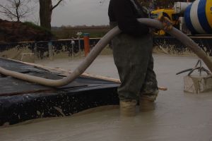 Vloerisolatie in 2009. Toelichting: 50 cm schuimbeton – 5 Rc, (zie foto over het storten van het beton. )