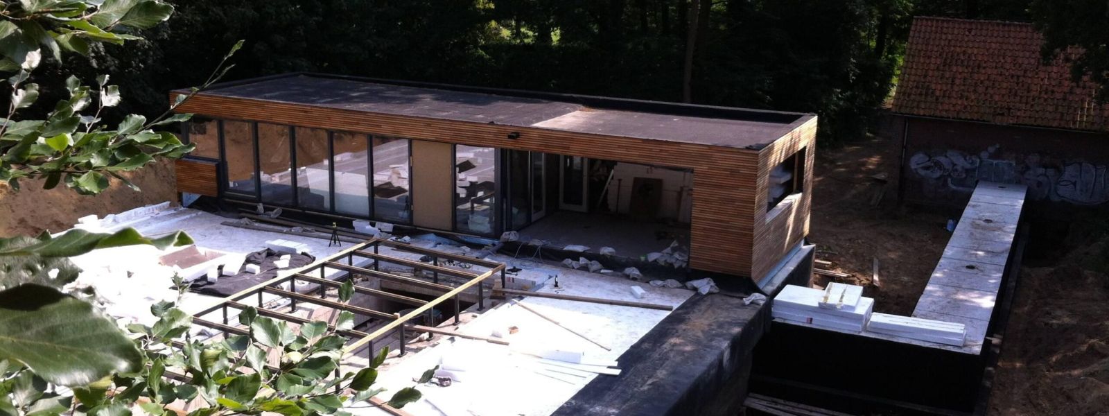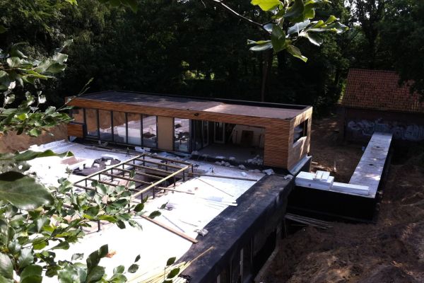 Zeer energiezuinige woning van gebruikte materialen met vegetatiedak, drievoudig glas en regenwater hergebruik