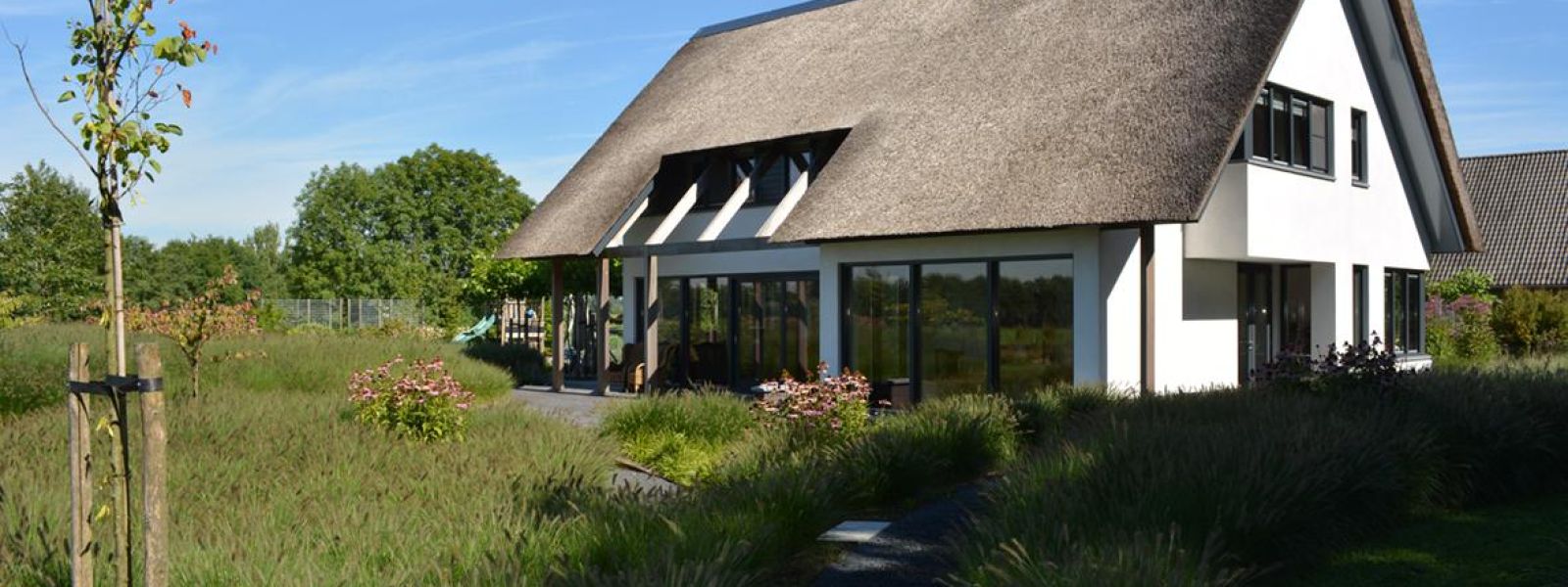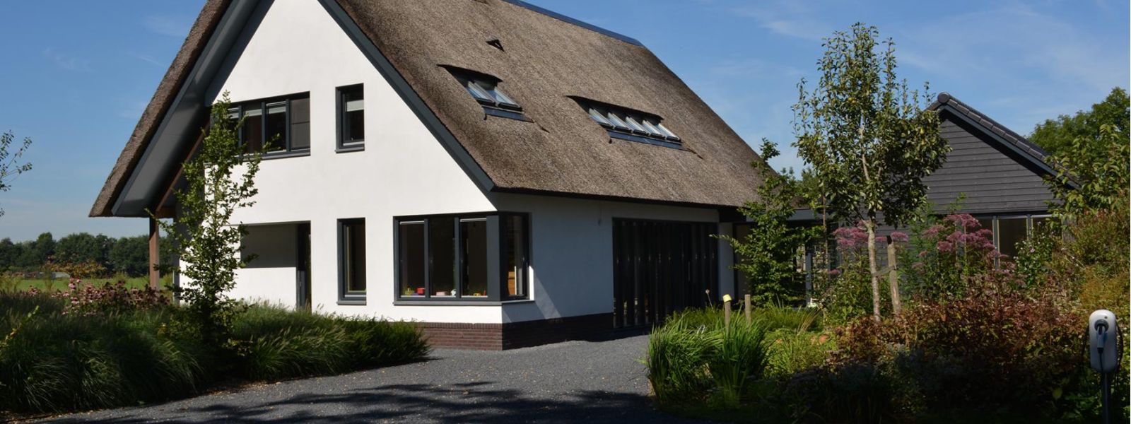Woning rietgedekt RC 6,0 (Unilin Unigreen dakelementen 4,5 RC) en Bijgebouw met dakpannen (Unilin Unisupur dakelementen 3,5 RC)