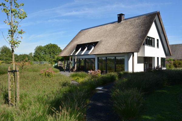 Woning rietgedekt RC 6,0 (Unilin Unigreen dakelementen 4,5 RC) en Bijgebouw met dakpannen (Unilin Unisupur dakelementen 3,5 RC)