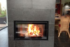 1/3 is stralingswarmte en 2/3 wordt warm CV-water wat naar de buffer gaat. Het is doorkijkhaard met aan beide kanten een deur. Deze heb ik met dubbelglas uitgevoerd dan krijg ik de meeste CV water wat ik door het hele huis kan gebruiken.