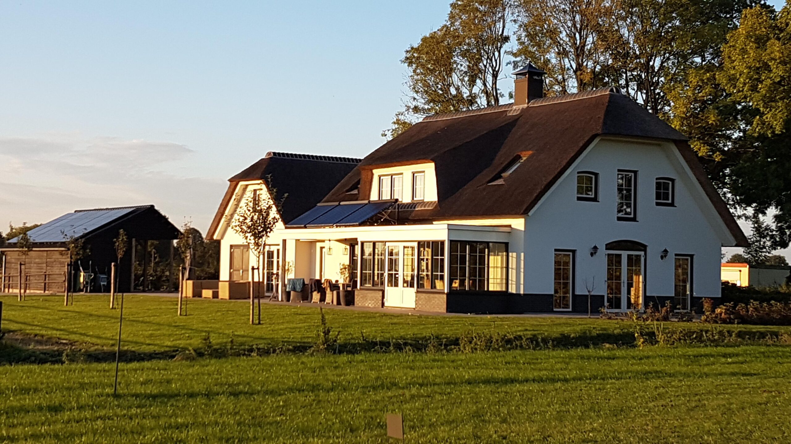Het huis is door mijzelf in 2013 ontworpen en in 2014 gerealiseerd. Om de kosten te drukken, de bouwtijd zo kort mogelijk te houden en te zorgen voor de juiste materialen en installaties, was ik zowel projectleider, planner als inkoper. Omdat het midden in het agrarisch buitengebied van Lunteren staat, heb ik het ontwerp gebaseerd op het eeuwenoude Hallehuisboerderij concept. Kennelijk zo geslaagd dat vele voorbijgangers (wij wonen aan drie toeristische wandel- en fietsroutes) menen dat het om een gerenoveerde boerderij gaat. Bij de keuzes voor materialen en installaties diende de Trias Energetica als uitgangspunt: 1. probeer zoveel mogelijk energie te besparen, 2. wek de benodigde energie zo duurzaam mogelijk op, 3. zet deze energie zo efficiënt mogelijk in.