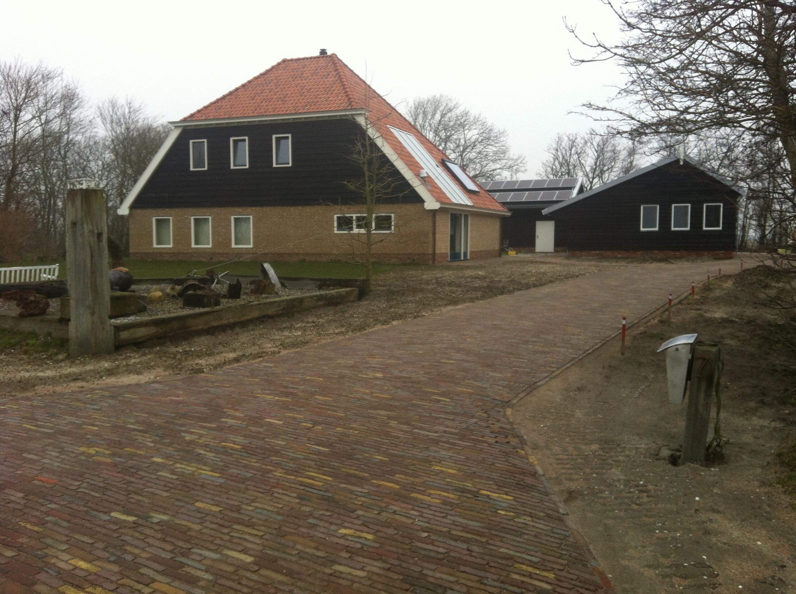 Na sloop in 2015 van oude stolp, nieuwbouw met 2/3 stolp. Traditioneel vierkant, volledig in het zicht gebleven. Casco via aannemer, overig in eigen beheer. Het hele bouwblok, 1400 m², is ongeveer 50 cm boven straatniveau opgehoogd, waardoor ook de garage gesloopt is. Vervolgens nieuwbouw garage met werkplaats en een boothuis waarop 22 zonnepanelen. Er is bij alle gebruikte materialen gekozen voor zoveel mogelijk natuurlijk en dus duurzaam, zoals vlas en Texelse wol voor isolatie. Wandbekleding; hout, leem of tegels.