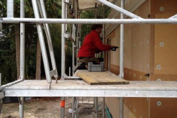 Goed isoleren (RC van gemiddeld 5,0 van dak, muren en vloer), combinatie steenwol in HSB-wanden + houtvezelplaat op stijlen geschroefd