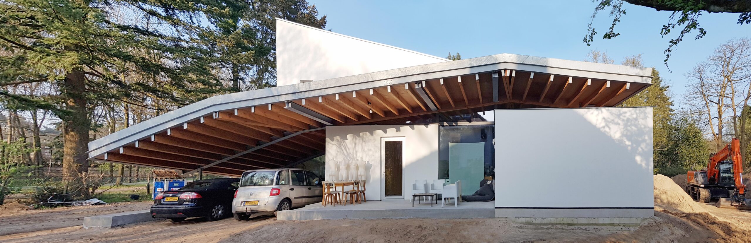 Bewoner = Architect. Een vrijstaande nieuwbouwwoning, geheel energieneutraal, unieke eigentijdse vormgeving afgeleid van gebruiks- en duurzaamheidseisen, zongericht, grote overstekken, geïntegreerde veranda, carport en buitenberging, geheel natuurlijk heidegebied tuinplan, bouwtechnisch: wanden Rc=6, dak Rc=7, triple glas, Solvis warmtepomp, Solvis750L voorraadvat, Solvis zonnecollector, PV panelen.