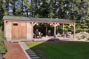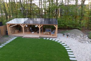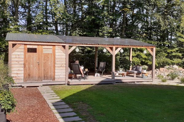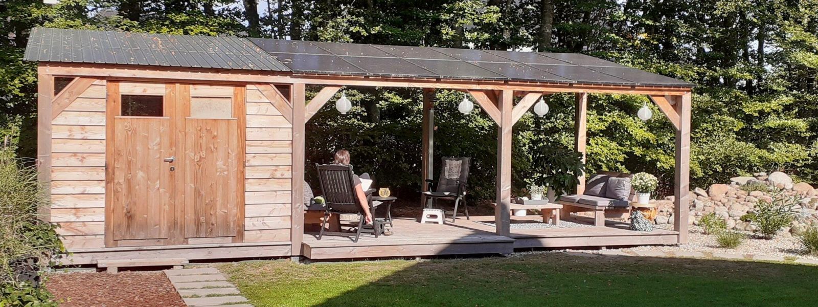 12 zonnepanelen op veranda in de achtertuin.