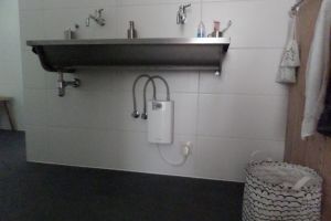 Warm tapwater badkamer en keuken via elektrische doorstroomverwarmers.