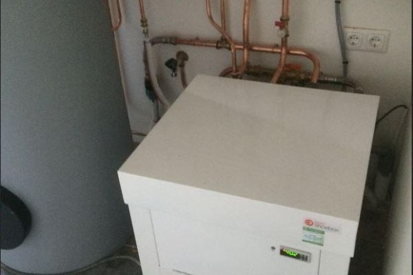 De hoogfdverwarming voor de woning is ee n6 kW -warmtepomp van Kensa. De 6 kW was nodig omdat we met 5 personen in het huis wonen en de warmtepomp bijspringt voor de verwarming van het boilervat. De warmtepomp haalt de (beperkte) energie uit 2 bronnen van 80 meter diep.. Dewarmte wordt in de woning verspreid door vloerverwarming. Deze is alleen aangelegd op de begane grond. Het gebalanceerde ventilatiesysteem zorgt er voor dat de warmte die beneden wordt afgeven, ook op de bovenverdieping komt. Boven is dus geen verwarmingssysteem aanwezig.