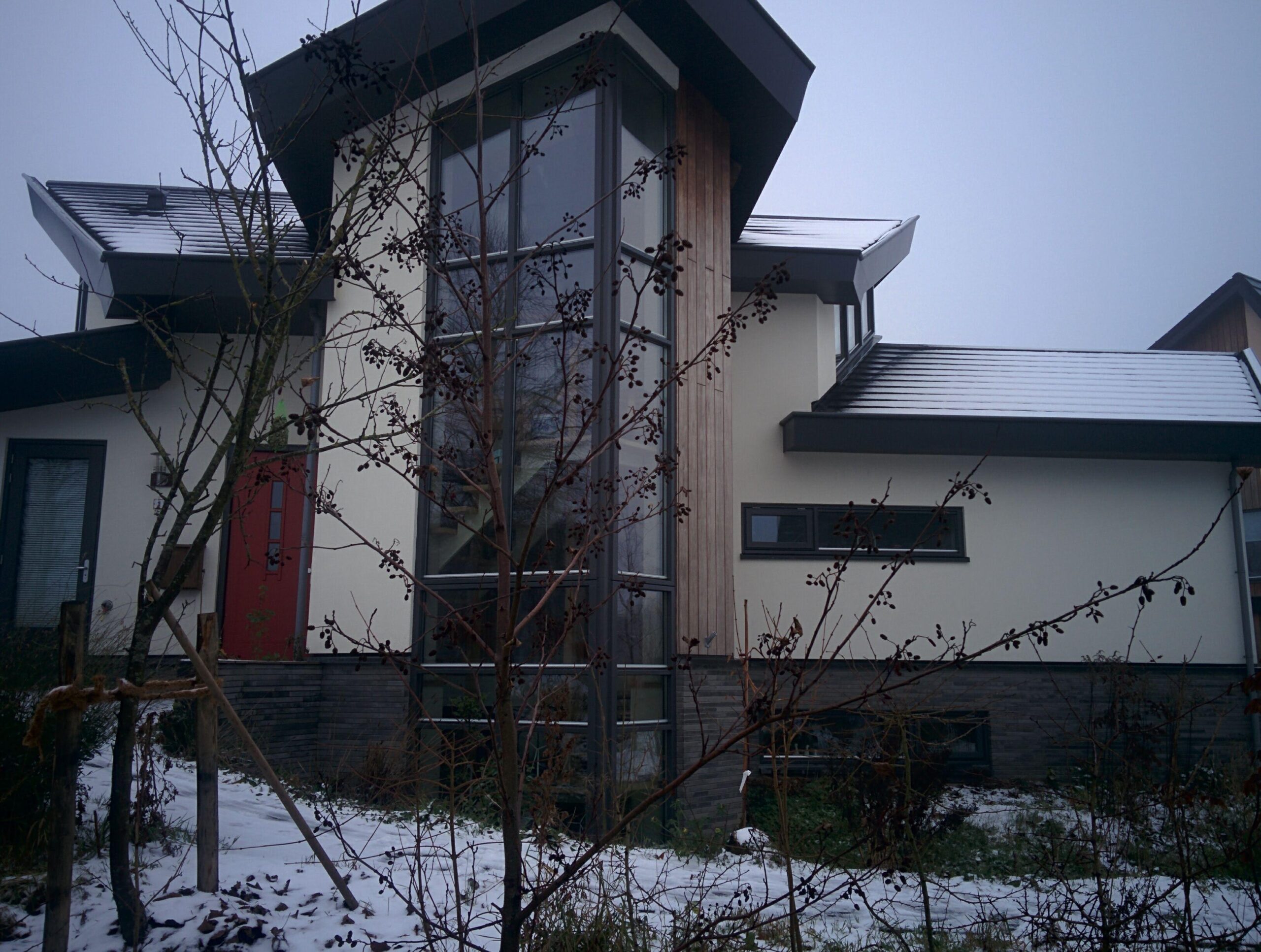 Wij hebben een zeer goed geïsoleerde houtskelet woning (dikke muren met houtwol isolatie en tripple glas). Het huis wordt geventileerd via een balans ventilatie systeem en verwarmd met een grondwater warmtepomp die beide gevoed worden door de stroom die opgewekt wordt met zonnepanelen. Deels is er een groen dak (isoleert ook!) en om het huis is veel groen en wadi’s om water goed te kunnen bergen. We hebben onze 8 regenpijpen allemaal (deels) afgekoppeld; 2 ervan zijn aangesloten op een regenton (200 en 400 liter) voor bewatering van tuin- en kamerplanten, 3 op een waterzaksysteem van 4,5 m3 waarmee we toiletten, wasmachine en buitenkraan van regenwater kunnen voorzien en de andere 3 wateren af in de wadi’s.