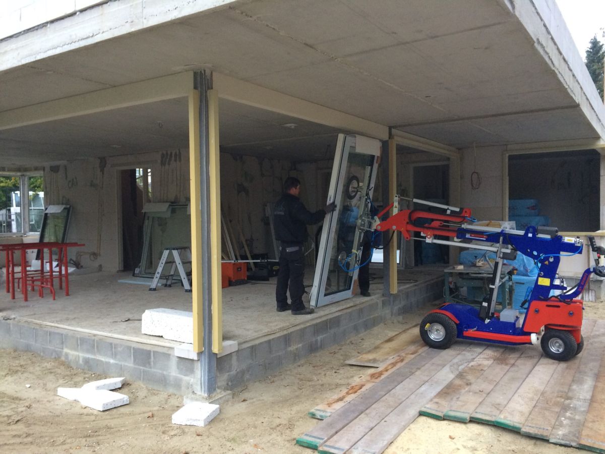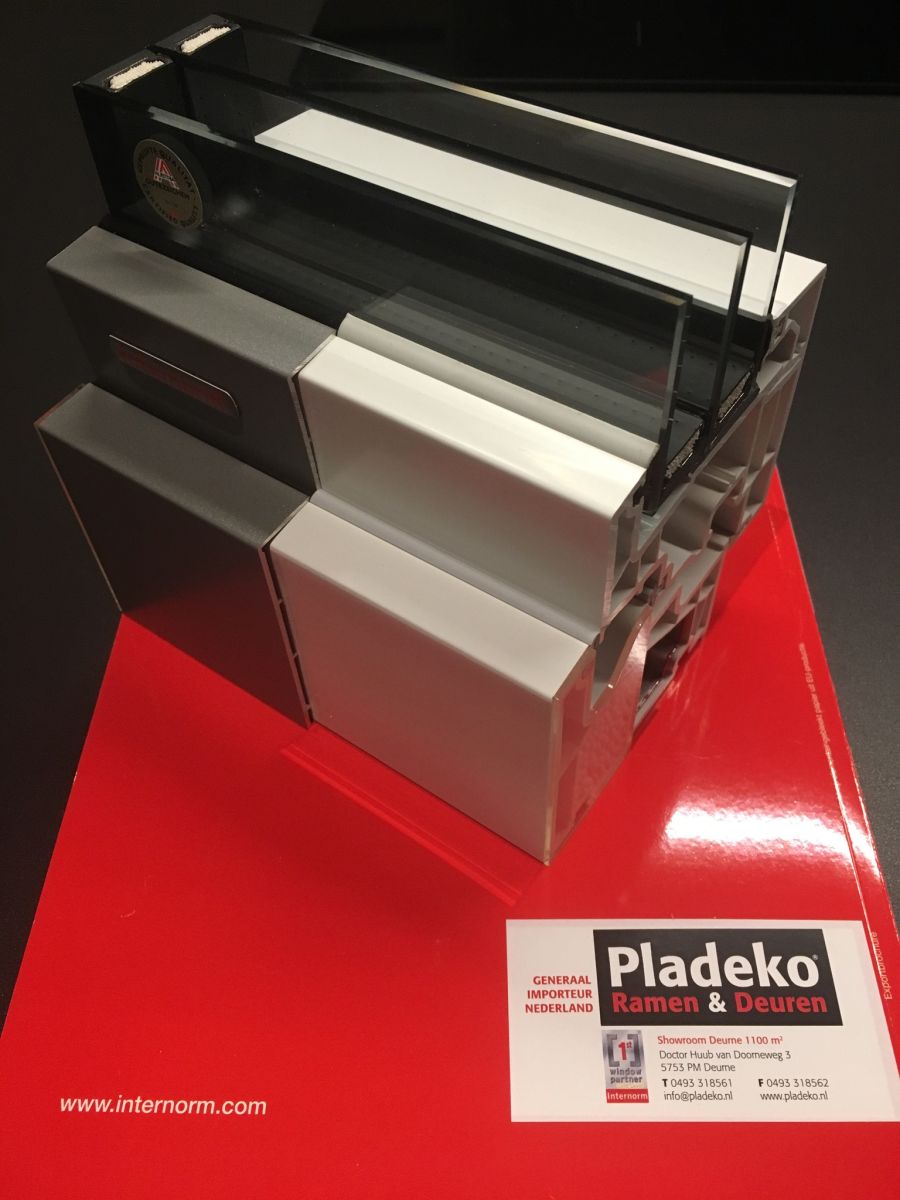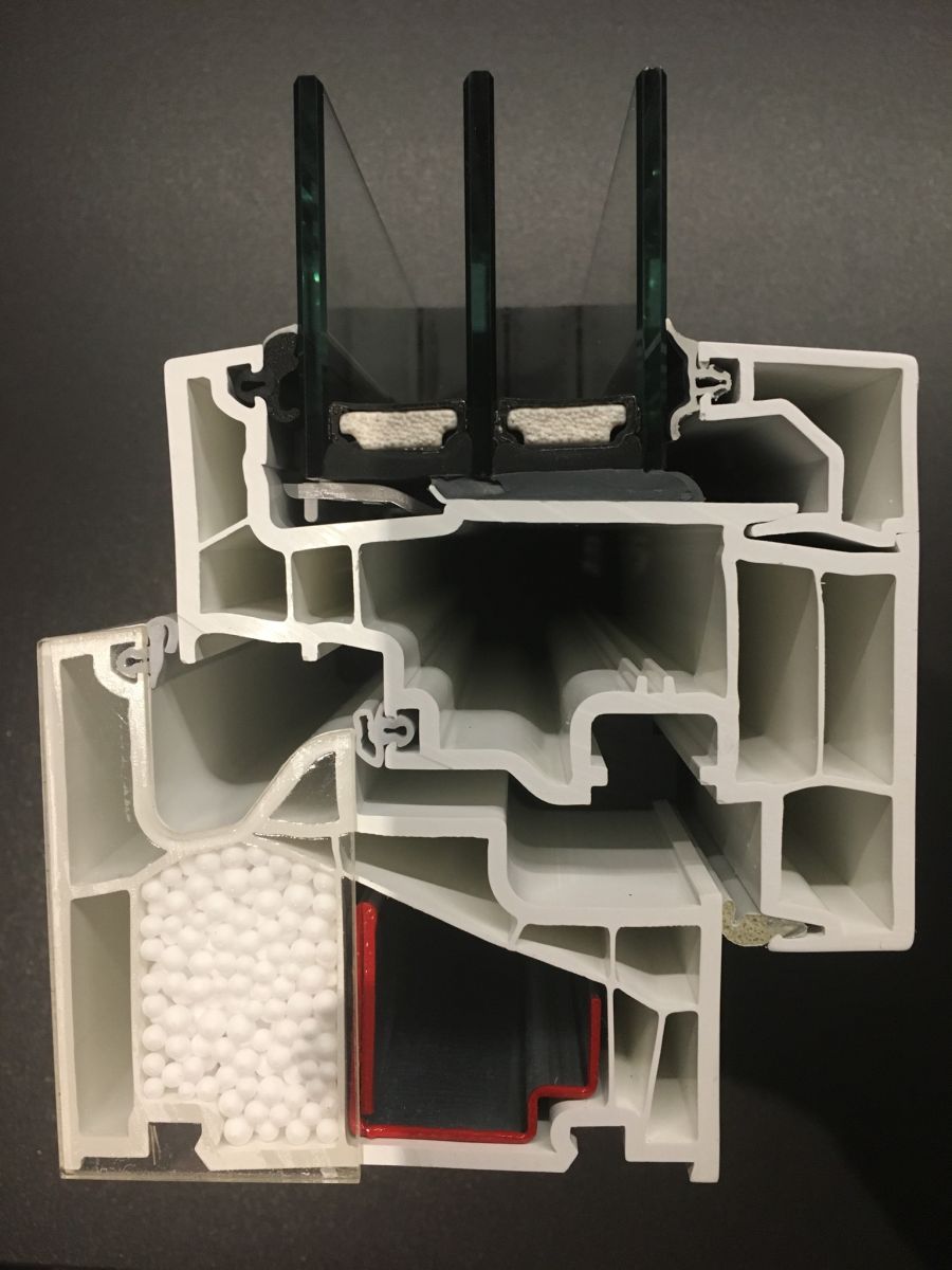 Bij keuze voor triple glas is het belangrijk om ook goed isolerende kozijnen te kiezen. Anders loop je risico op condensatie op het kozijn doordat deze kouder worden dan het raam en de geïsoleerde muren. De kozijnen van Internorm bleken de beste isolatiewaarden te hebben. Andere merken kwamen niet verder dan een U-waarde van 1,0 W/m2K. Ook niet verkeerd overigens maar bij zoveel raampartijen en flink geïsoleerde gevels maken kozijnen veel verschil op het geheel. Op de foto staat een voorbeeld doorsnede van het kozijn met kunststof binnenkant en aluminium buitenzijde. De kozijnen die wij hebben toegepast hebben 3 geisoleerde kamers waarvan 1 gevuld met geperste isolatie voor nog betere waarden. Normaal wordt de isolatie erin geschoven met dus nog minimale lekken.
