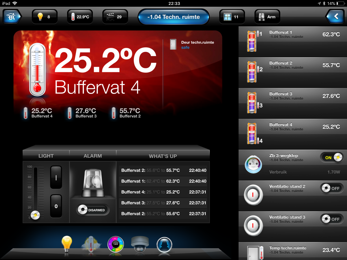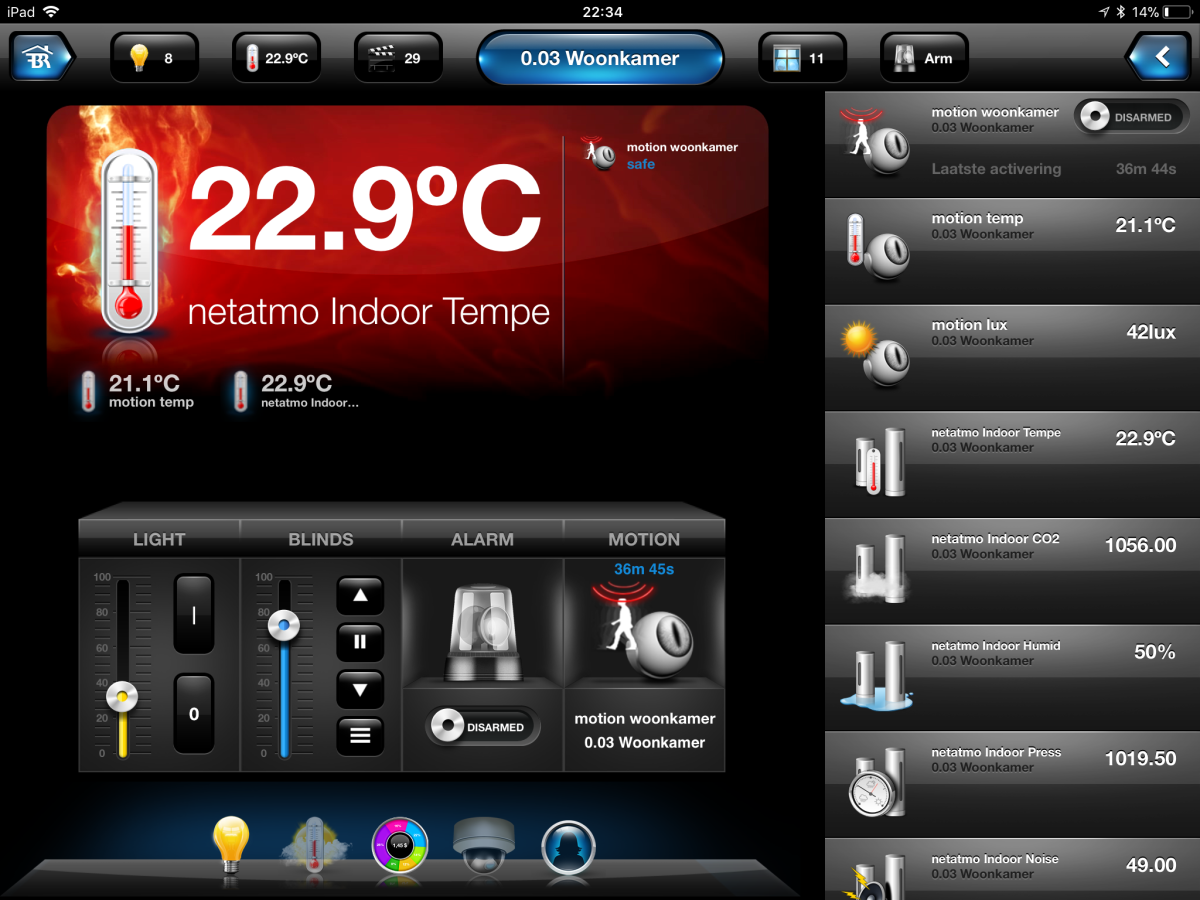 – automatisch sluiten zonwering: obv lichtsterkte (lux) en ruimtetemperatuur gemeten door de Fibaro bewegingssensoren