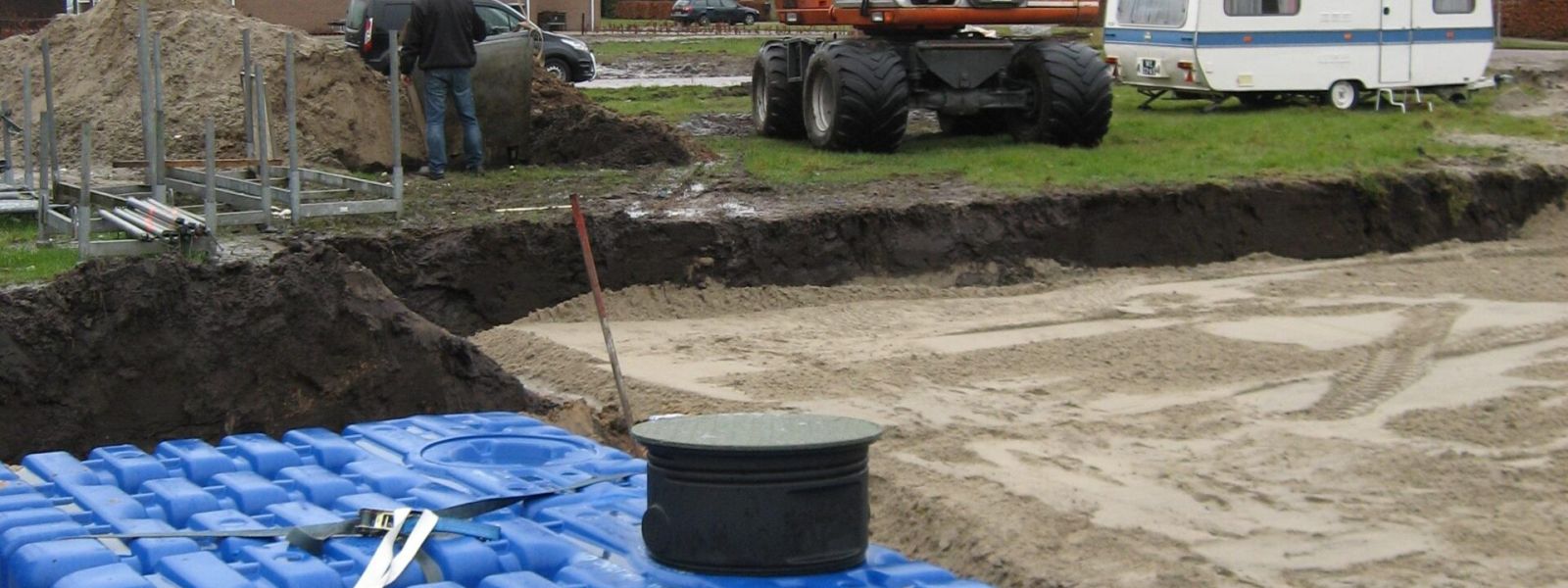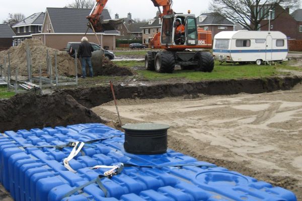 Regenwateropvang via grindbed in ondergrondse tank van 7500 liter;