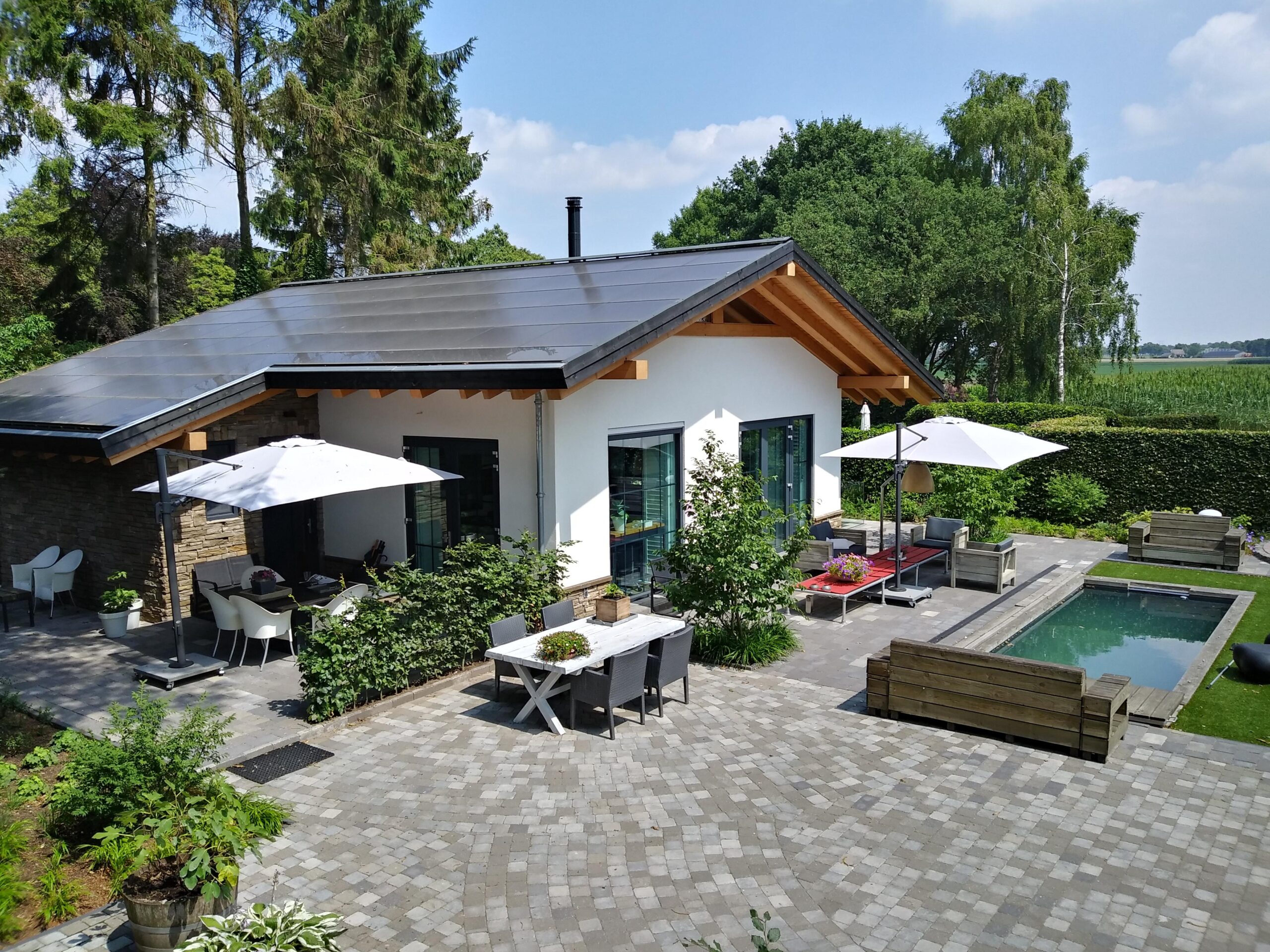 We hebben ons dak volledig opgebouwd uit 138 stuks zwarte Solar Frontier zonnepanelen. Voor de start van de bouw hebben we 3 vertikale lijdingen laten boren voor het gebruik van aardwarmte. Deze aardwarmte wordt gevoerd naar de Nibe warmtepomp die de woning van warmwater en warmte/koeling voor de vloerverwarming levert.