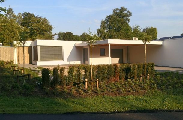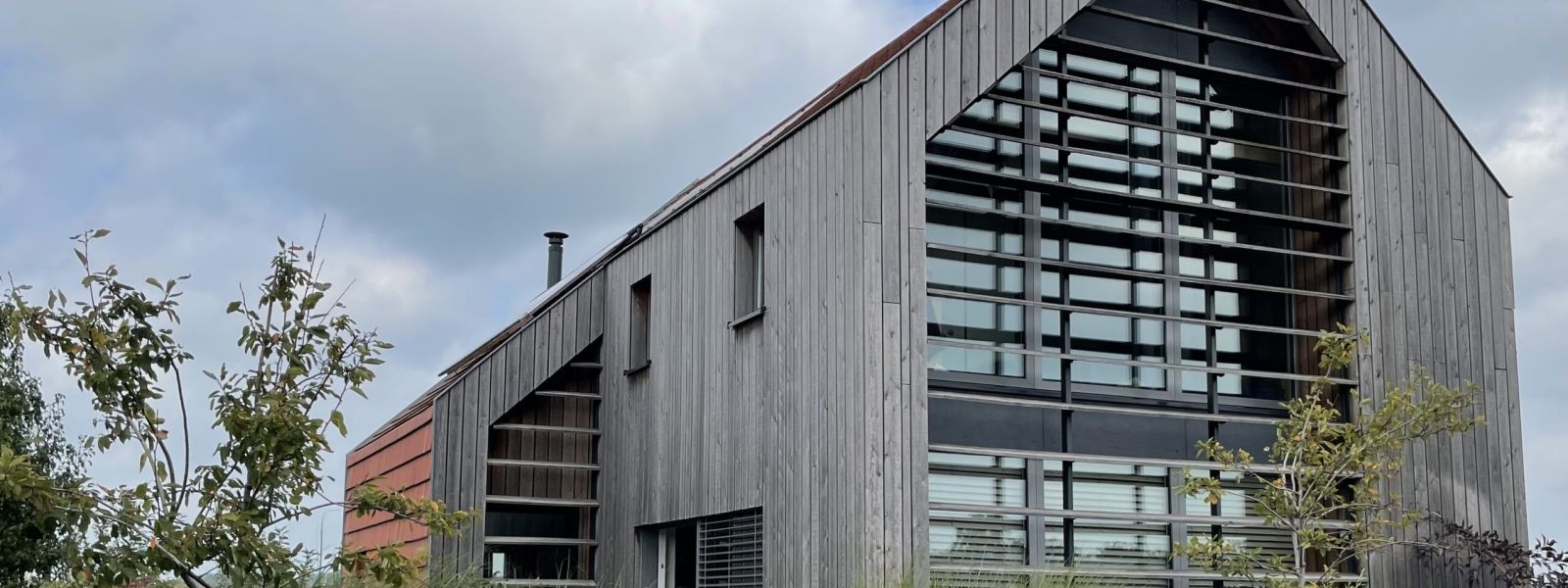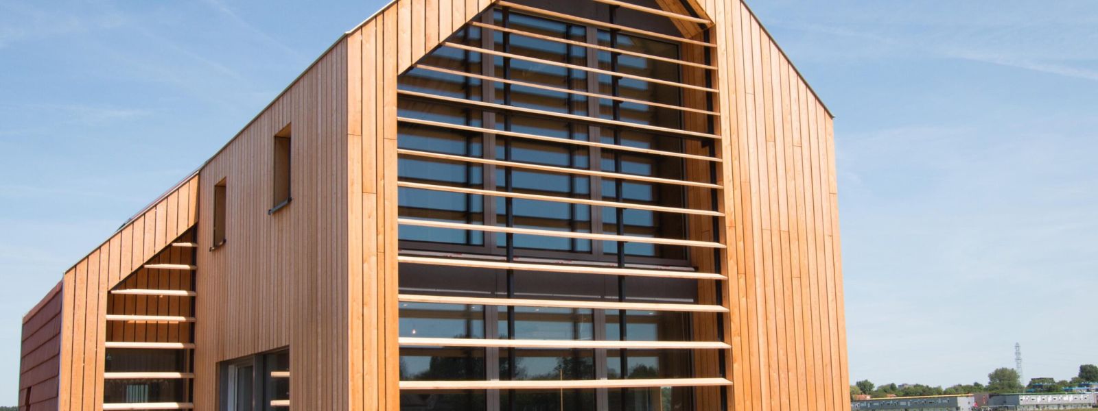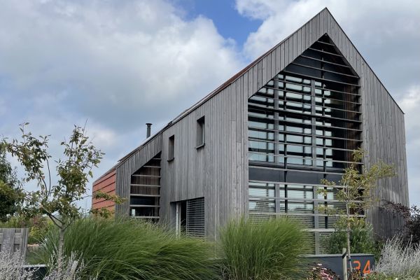 De grote glazen pui in de voorgevel is voorzien van houten lamellen. Dit zorgt ervoor dat de hoge zomerzon buiten gehouden wordt, in de winter warmt de laag staande zon de woning op. De oriëntatie van het gebouw, natuurlijke materialen, hoge isolatie waarde, zonnepanelen & warmtepomp zorgen dat deze woning zeer duurzaam en energiezuinig is.