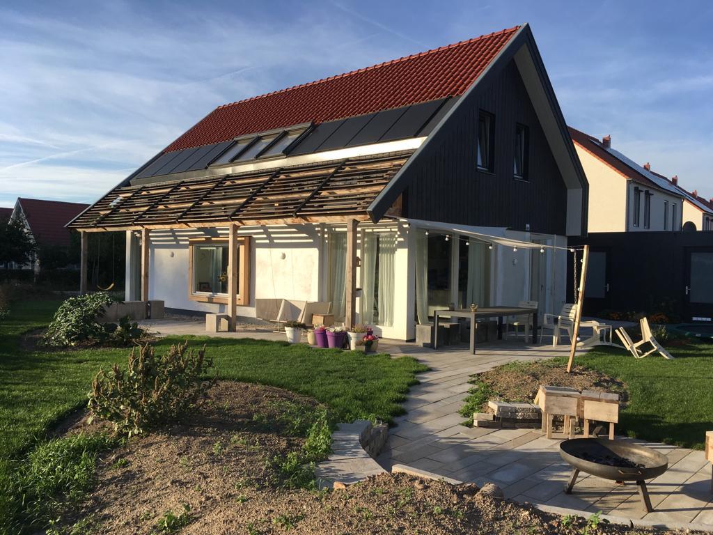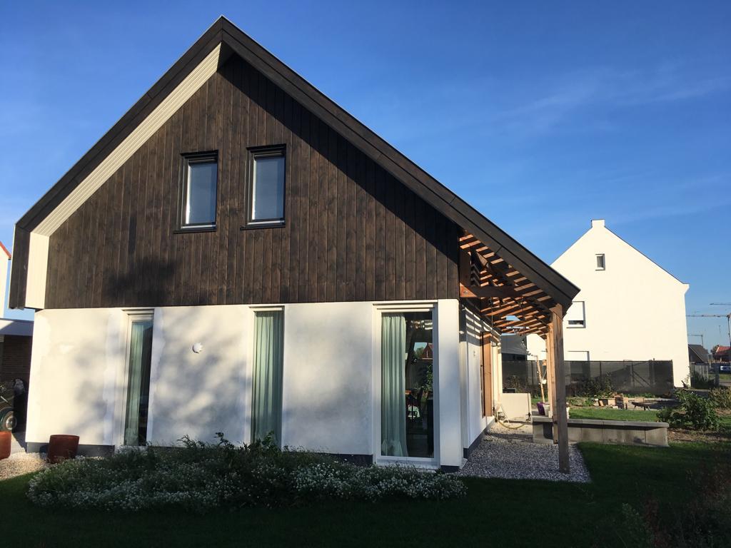 Welkom in Kalkhennephuis Weert! Het eerste hennephuis in Limburg…Ons duurzame houtskelet huis is gebouwd met natuurlijke biobased materialen als hennep, hout en vlas en het past ons als een heerlijke jas. #kalkhennep #biobased #vlasisolatie #houtskelet #hergroeibaar #zonneorientatie #ademendemuren #gezondwonen #natuurlijkezonwering #hout #hennep #geenPUR #groenetuin Onze woonwens in 2016: wonen in een tent maar dan comfortabel In 2016 verhuisden we met ons jonge gezin terug naar onze geboortestad Weert. We wilden meer buiten zijn, meer groen om ons heen, meer schone lucht en dichterbij onze ouders wonen. Als kampeerders vindenw e het altijd heerlijk om in de zomervakantie buiten te leven in onze tent. Eenvoudig en in contact met de omgeving en lekker buiten zijn. Zo moest ons nieuwe huis ook worden! Wonen in een tent maar dan comfortabel op Laarveld in Weert, buiten en toch in contact met buren in onze kinderrijke buurt. Gezond wonen Het belangrijkst technische uitgangspunt van ons ontwerp was: gezond kunnen wonen. Dat betekent voor ons een woning met zoveel mogelijk natuurlijke materialen en zo weinig mogelijk technische installaties. Al snel werd duidelijk dat we ons huis zouden bouwen in houtskelet met natuurlijke isolatie. Hierdoor ontstaat een ‘ ademende’ muur met een mooi binnenklimaat. De meeste huizen zijn ‘potdicht’ door het gebruik van minerale isolatie en spouwmuren met folie. Daarmee trek je een soort regenjas over je woning, terwijl wij juist een huis met een Gore-Tex jas wilden, een huis dat ‘ademt’. Pionieren in kalkhennep Ons huis heeft een houten skelet met daaromheen een massieve buitenmuur van ‘kalkhennep’. Kalkhennep is een natuurlijk of biobased ‘beton’ dat gemaakt is door gehakselde stukjes hennephout te mengen met zuivere kalk en water. In 2016/2017 waren er in Nederland slechts een handvol woningen gebouwd met hennep. Maar na een avond onderzoek op internet was het voor ons duidelijk: dit is wat we moeten doen! Het is een natuurlijk materiaal, hernieuwbaar, hennep vangt CO² in als een malle, heeft uitstekende ademende kwaliteiten, houdt de warmte goed vast en het geeft ook wel een boost aan onze drang naar innovatie. We bezochten enkele andere pioniers en deelden onze passie voor natuurlijk bouwen en innovatie. Onze omgeving reageerde lacherig op onze ambities om met hennep te bouwen. Nu 8 jaar later is kalkhennep helemaal in opkomst! Techniek van kalkhennep Hennep isoleert zeer goed door de vele micro poriën in het hennephout. Deze zorgen samen met het kalk voor muren met een meer een constante temperatuur en luchtvochtigheid in huis. De muren zijn dampopen, ze nemen vocht op en staan het weer af. Het gebruik van dit natuurlijke beton zorgt er tevens voor dat het huis CO² opneemt in plaats van uitstoot. Hennep groeit in 100 dagen van een zaadje tot een oogstbare plant van 4 meter hoog. Bij de groei neemt de plant al heel veel CO² op uit de atmosfeer. En na het verwerken in de muren wordt tientallen jaren CO² in de muren ingevangen, omdat de kalk reageert met CO² uit de lucht. Deze methode was al bekend bij de Romeinen! . Duurzaam is het ook, mocht het huis ooit afgebroken worden, dan is de hennep en de kalk weer over de akkers uit te strooien. Het materiaal is daarmee ook niet milieubelastend. Stucwerk van kalk en leem en natuurlijke verf De massieve muren moeten ademen. Daarom zijn ze aan de buitenkant afgewerkt met stucwerk van kalk en ademende kalkverf en aan de binnenzijde is leem aangebracht. De leem zorgt ook voor een extra warmtebuffer: de warmte wordt langer in de muur vastgehouden, waardoor de muren in de winter niet koud aanvoelen. Voor de rest van het huis hebben we gekozen voor muurverven op natuurlijke basis. Dit alles draagt bij aan een erg prettig binnenklimaat en gezonde lucht binnen. Comfortabel in zomer en winter Overigens is bij de plaatsing van het huis de positie ten opzichte van de zon belangrijk geweest. Er is een lamellenconstructie aan de zuid/west kant van het huis waardoor het ’s zomers binnenshuis niet te warm wordt en we ’s winters optimaal gebruik maken van de natuurlijke warmte van de laagstaande zon. In onze tuin hebben we op strategische plekken bomen aangeplant zodat we optimaal gebruik kunnen maken van de koelte van de bladeren in warme zomers. Na enkele jaren kunnen we stellen, dat het in huis en tuin aangenaam is bij hitte.Duurzaamheidsambities Ons uitgangspunt was een gezond en comfortabel huis. Al heel snel kwamen we uit bij biobased materialen. Dat zijn natuurlijke materialen die hernieuwbaar zijn en die het aardse ecosysteem niet schaden. Met hennep in de wanden, vlas in de dakisolatie, het houtenskelet, leem en kalkstuc, natuurlijke verf, houten vloeren is ons huis zowel comfortabel als duurzaam voor de aarde. We hebben geen nul op de meter woning en we zijn ook geen grammenjagers wat betreft energiebesparing.