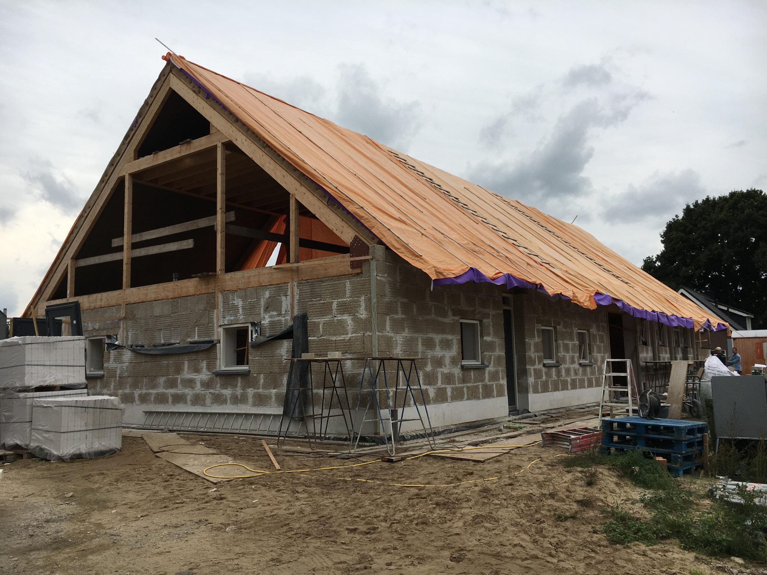 Tweefamiliehuis IN AANBOUW op een landelijke plek. Houten draagconstructie (eiken en vuren). Binnen- en buitenwanden van Isohemp kalkhennepblokken. Stucwerk van zuivere kalkmortel. Vlas als dakisolatie. Deels houten en deels aluminium kozijnen. Door het gebruik van natuurlijke materialen ontstaat een bijzonder aangenaam binnenklimaat: ademend, niet alleen isolerend maar ook warmtebufferend, vochtregulerend, akoestisch aangenaam, geen uitstoot schadelijke stoffen. De kas over twee verdiepingen levert warmte in winter, voor- en najaar. In de zomer gaat de kas open om de warmte juist kwijt te raken. Woning is flexibel in te delen en daardoor levensloopbestendig en geschikt voor samenwonen van meer generaties.