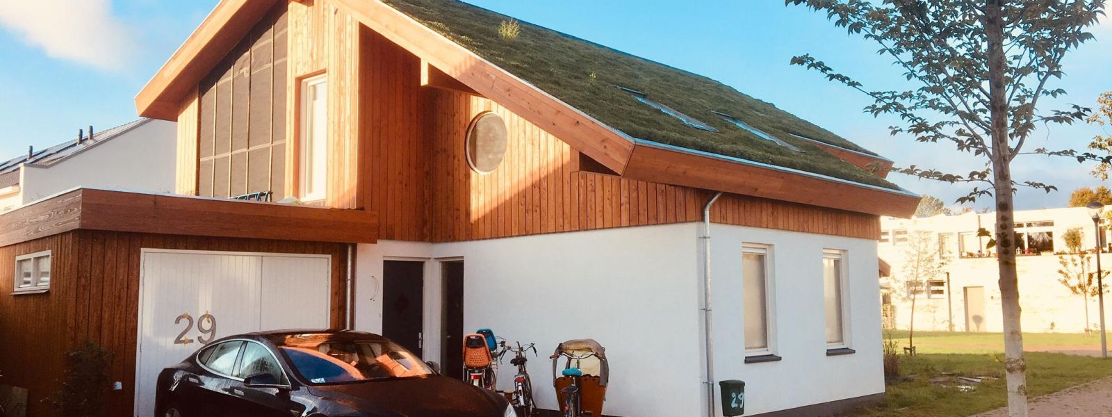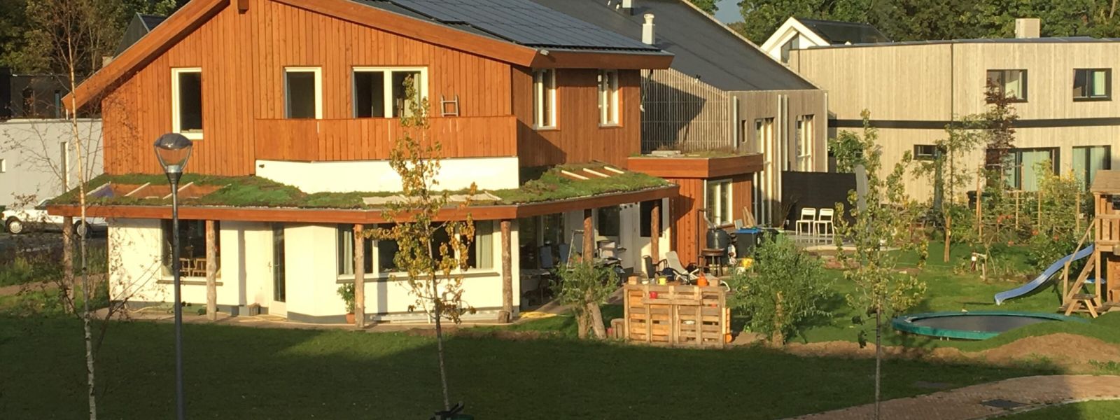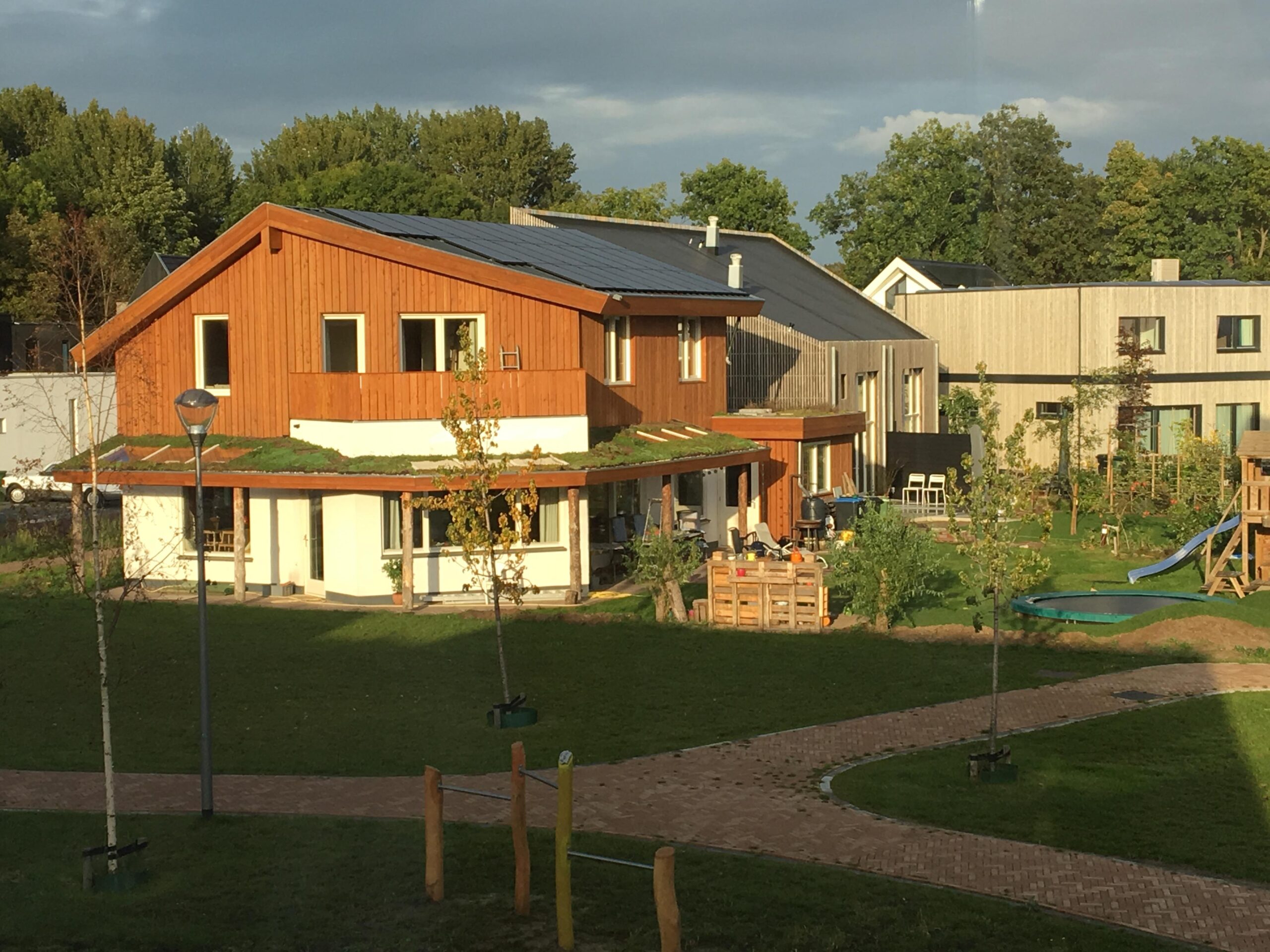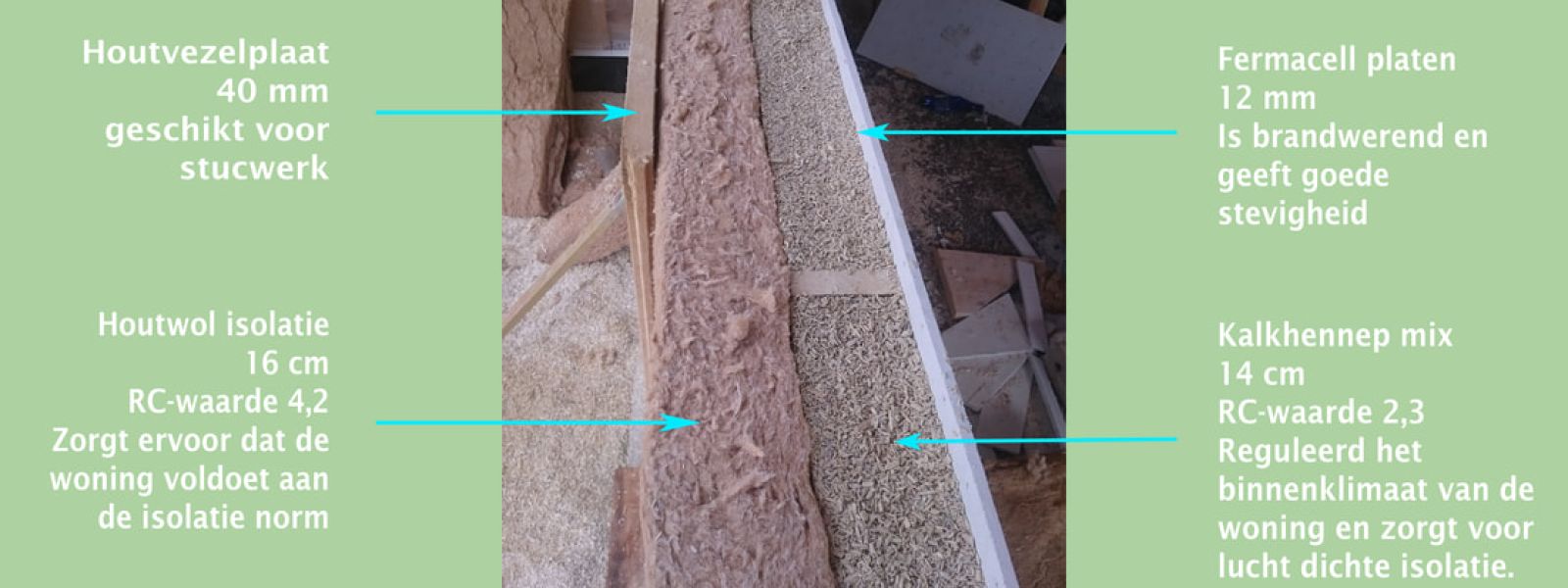 Ecobouw – Dampopen wanden geïsoleerd met kalkhennep, houtwol, houtvezel en leem, dak met vlas en sedum planten, vloer is geïsoleerd met lava gesteente – Minimaal gebruik van stenen/ beton / cement / ijzer. Geen gebruik van glaswol, steenwol, pur isolatie vanwege duurzaamheid / uitstoot bij productie . Low tech verwarming met alleen infrarood vloerverwarming, natuurlijke warmte doordat het huis op het zuiden georiënteerd is. – Zonnepanelen – Toilet met regenwater – Meervoudige recycle stortdouche waarbij warm water gefilterd en hergebruikt wordt. We hebben dubbele douchekop zodat je met meerdere personen tegelijk kunt douchen zodat je nog een extra besparing van warm water hebt. We hebben toekomstbestendig gebouwd doordat ook alle nodige faciliteiten eenvoudig op de benedenverdieping gerealiseerd kunnen worden. Tenslote hebben we ook creatief kindvriendelijk gebouwd met o.a. een speelkuil met doorkijkjes op de verdieping waardoor je contact kunt maken met de benedenverdieping, een groot hang en speelnet boven de speelkuil en een klimmuur 🙂