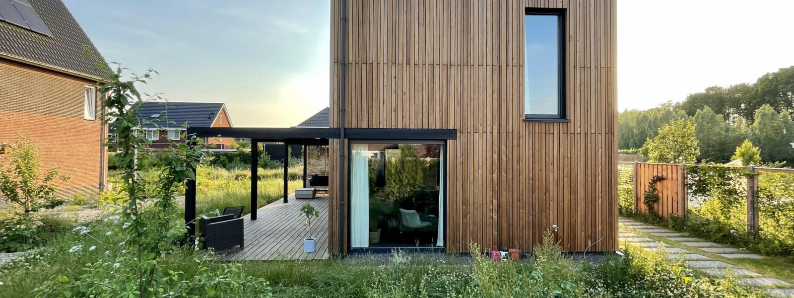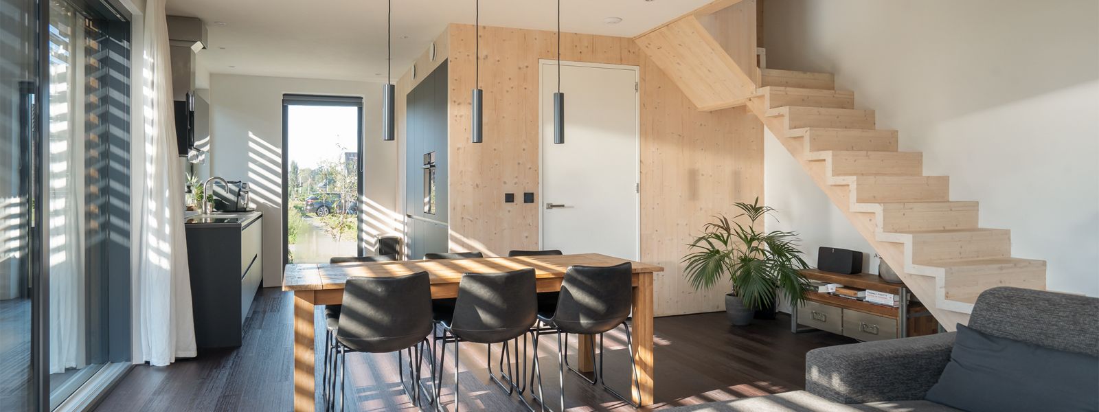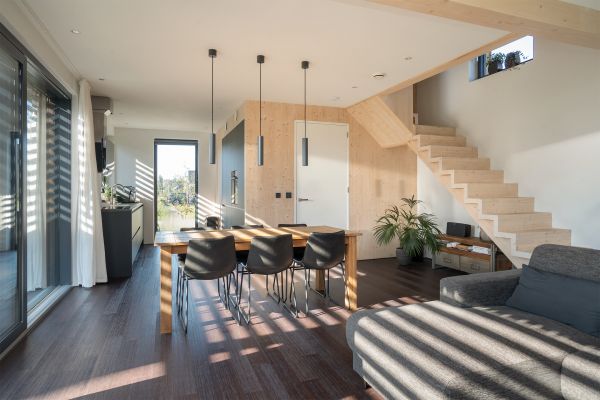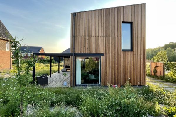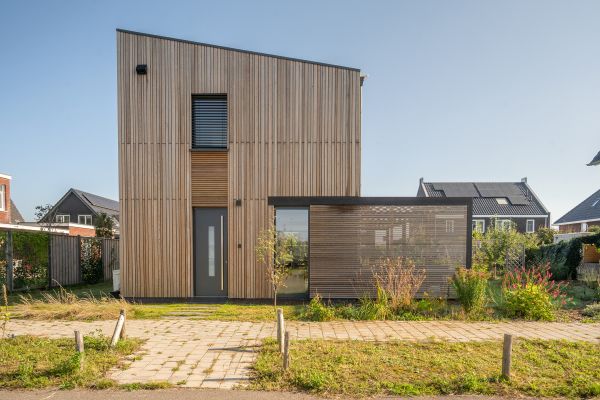 Passiefhuis. Met -10 buiten te verwarmen met een föhn. Houtskeletbouw met binnenwanden van CLT, damp open met natuurlijke isolatie, voornamelijk houtvezel. RC waarden van 10, 9 en 8 voor respectievelijk het dak, wanden en vloer. Er is goed gelet op gebruik van de zon als energiebron. Onder architectuur gebouwd. Architect: Evert-Jan Lemson