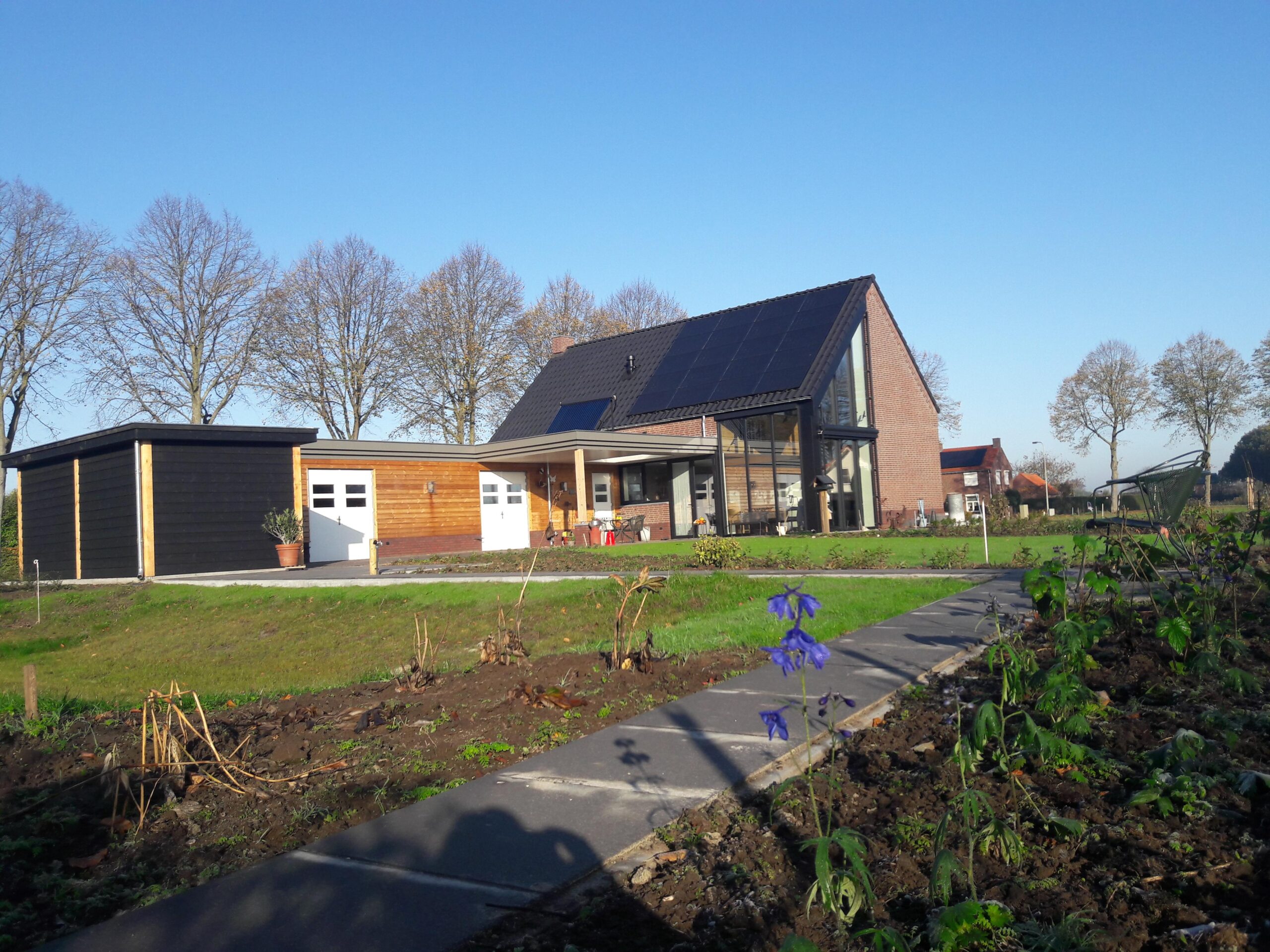 Er is bewust gekozen om te investeren in houtskeletbouw (prefab en duurzaam hout) en extra isolatie van buitenwanden (minimaal 8,4 m2 K/W), dakopbouw (minimaal 11,1 m2 K/W en vloer (minimaal 6,9 m2 K/W), driedubbel glas en verwarming via WTW en voor het plaatsen van zonnepanelen en zonneboiler. Voor de vriesdagen en de heel warme dagen zoals zomer 2020 hebben we een lucht-lucht warmtepomp (is airco) in de woonkamer/ keuken. Bij de inrichting (keuken, vloeren, trap, gordijnen ) is gekozen voor duurzame, lichte en herbruikbare materialen. Door te kiezen voor ondernemers uit de buurt blijven de transportafstanden kort. Toiletten kunnen met hemelwater worden gespoeld. De tuinaanplant met o.a. fruitbomen en wilgenknotbomen langs de dorperlossing geeft een verbetering van de biodiversiteit en er er blijft zicht op het mooie traditionele landschap met doorkijkjes. Ons tuinplan is gemaakt in overleg met de vogelbescherming.