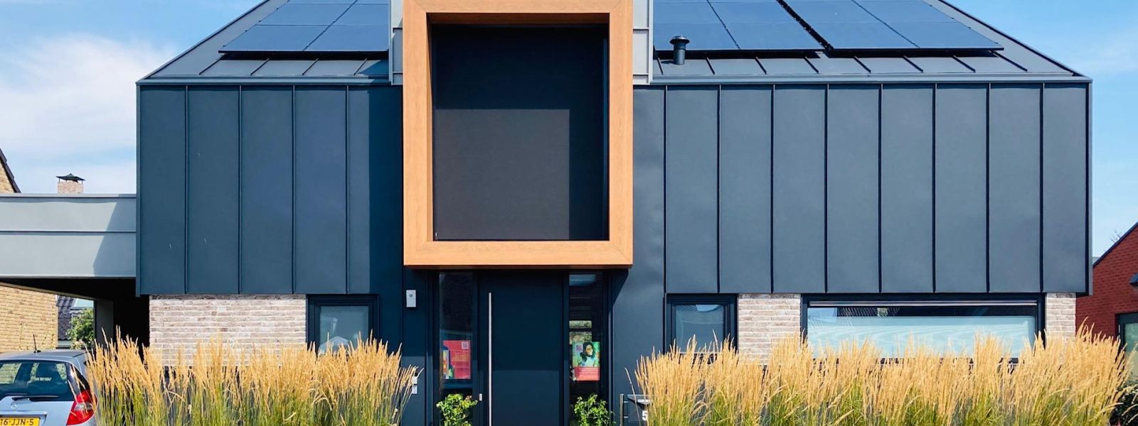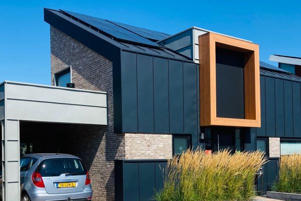 De woning is geheel in houtskeletpanelen opgebouwd op een fundering van circa 60 cm schuimbeton met daarop een constructievloer, zonder heipalen. De gevels zijn uitgevoerd in zink beplating en steenstrips. Buitenkozijnen en -ramen zijn van aluminium.