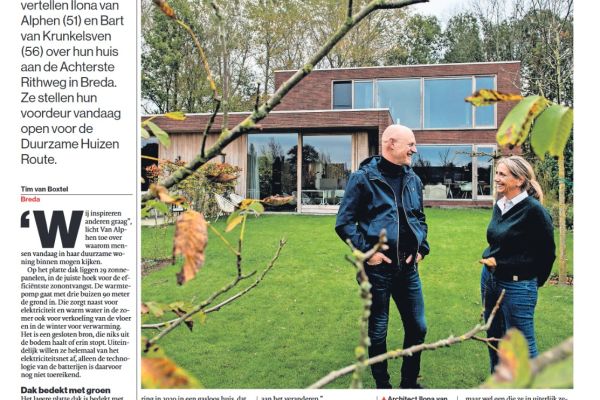 In 2020 is onze vrijstaande woning opgeleverd. De woning is door ons zelf ontworpen (ben zelf architect). Het betreft een gasloze woning met warmtepomp met bronnen, zonnepanelen, vloerverwarming/ koeling en een groendak. Omdat het een woning betreft in een natuurgebied wordt het hemelwater op het terrein afgevoerd en is er gekozen voor een woning met een zo klein mogelijke footprint met halfverharding en zoveel mogelijk inheems groen met onder andere een vogelbos.