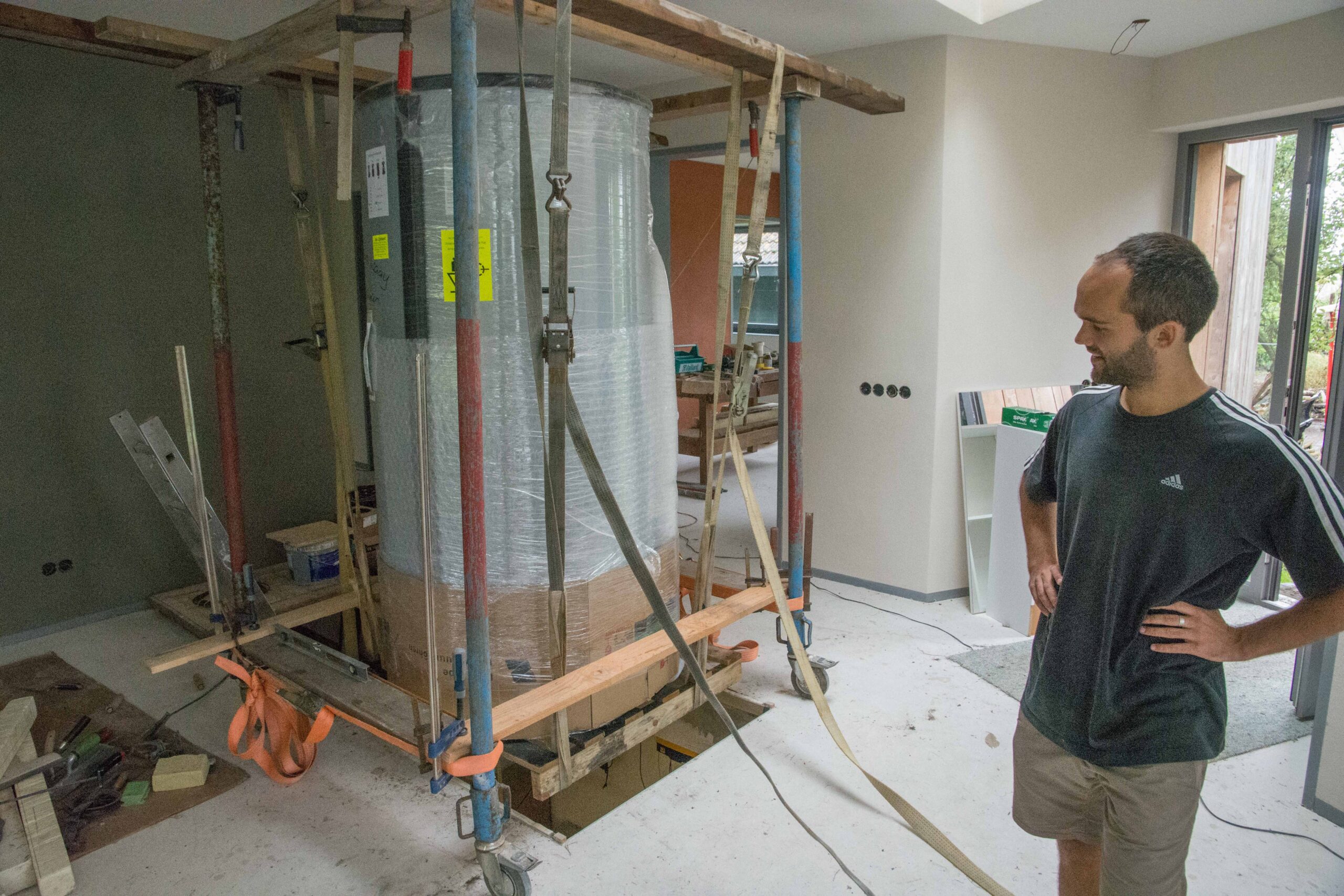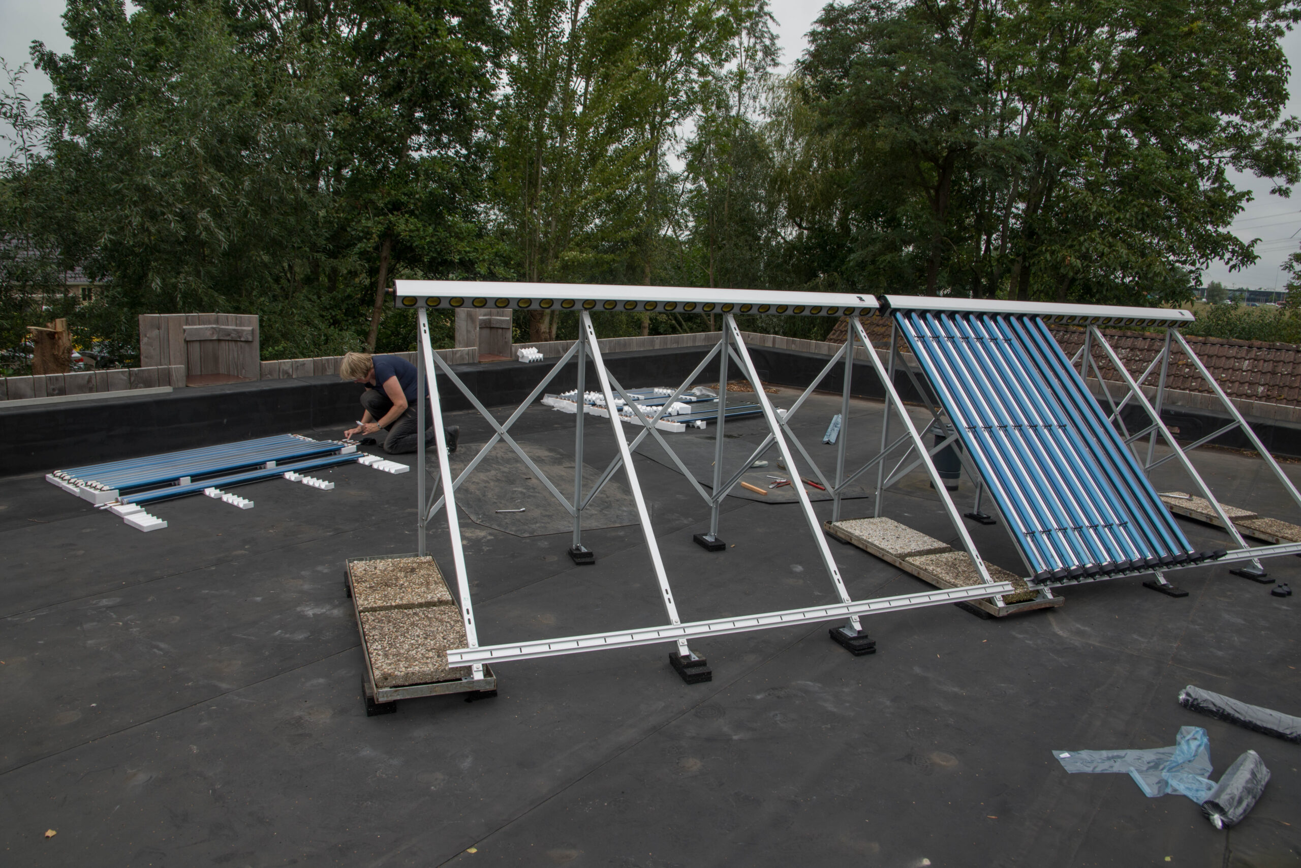 Buffervat 1000 liter voor warm tapwater en ruimteverwarming. Voeding door 72 heatpipes, elektrisch element bij overschot zonnestroom en houtvergasser in wintermaanden.