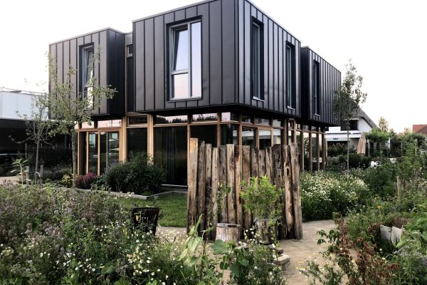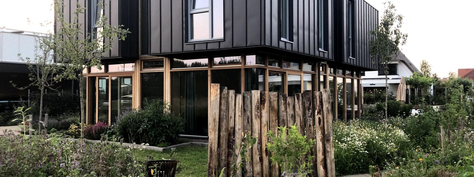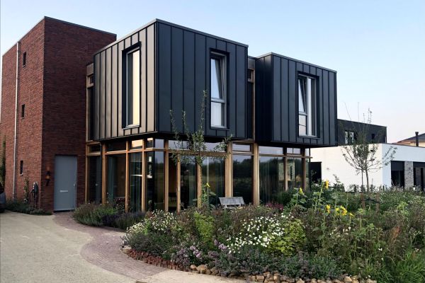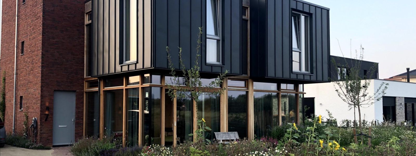 Houtskeletbouw huis met veel triple glas, grondwarmtepomp, zonnepanelen, zonneboiler, vloer- en plafond verwarming en koeling, gierzwaluw neststenen en een ecologische tuin.