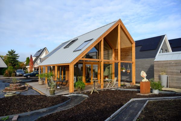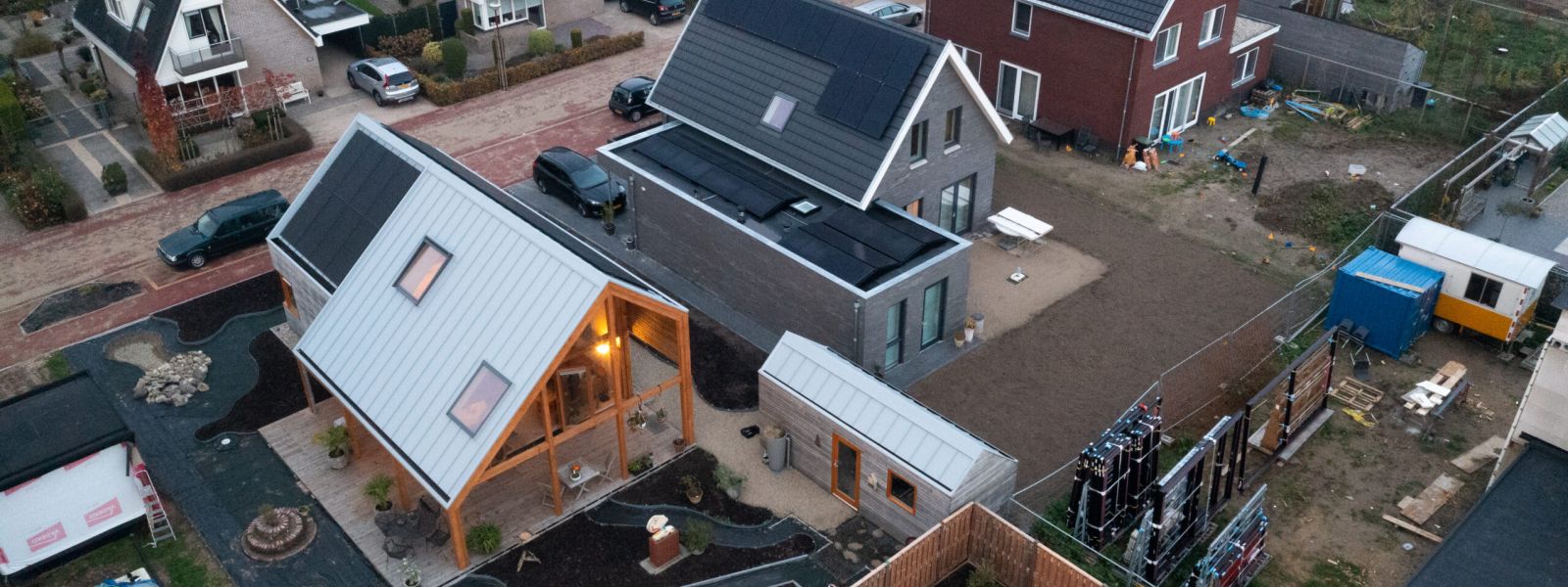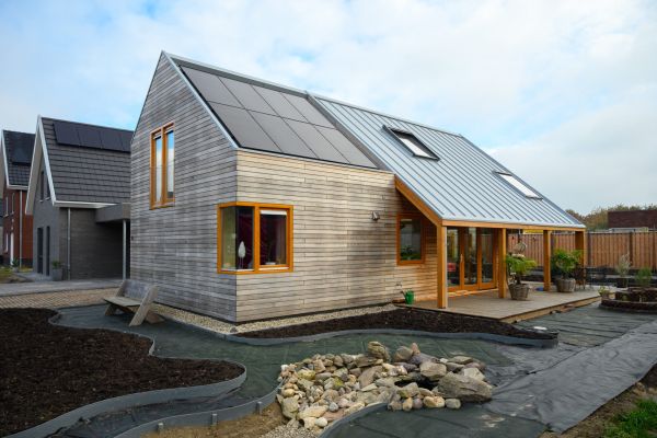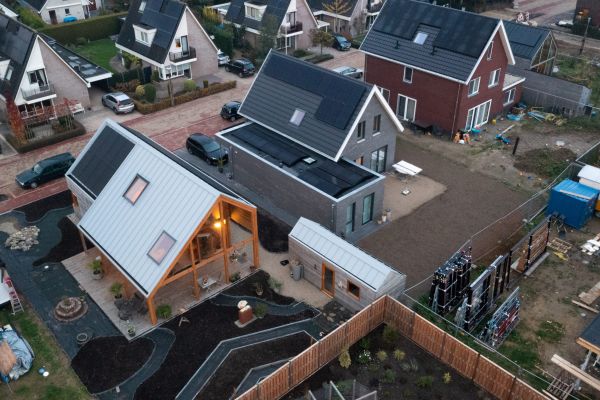 Onze woning is in 2021 gebouwd. We hebben het samen met de Woonpioniers uit Amsterdam ontworpen. Het is een variant op het type huis dat zij als Indigo op de markt hebben gebracht. Het is een houten huis waarbij rekening is gehouden met de instraling van de zon zodat het huis in de winter snel opwarmt en in de zomer koel blijft. De woning wordt verwarmd en gekoeld met een luchtwarmtepomp. Deze warmtepomp verwarmd ook het water in de boiler.