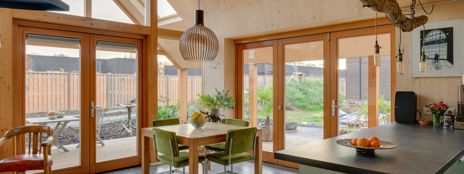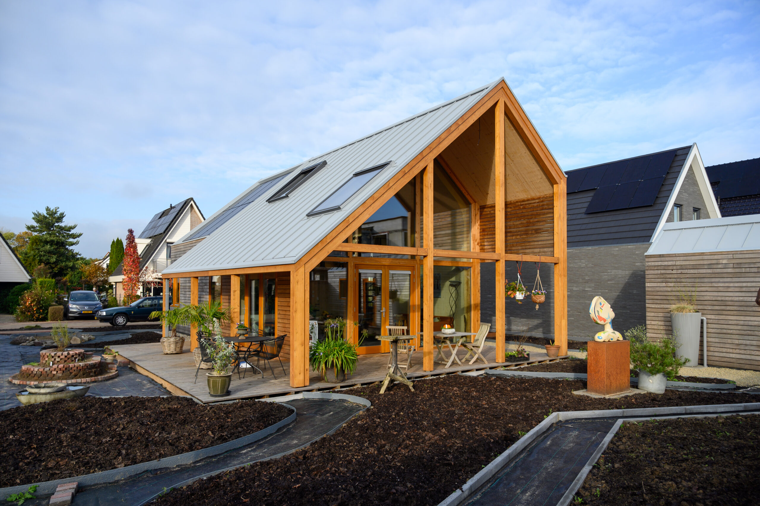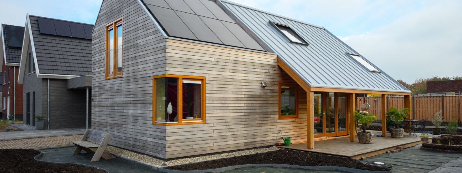 Vrijwel alle glas bestaat uit triple HR glas. De meeste gebruikte materialen zijn biobased. Isolatie bestaat uit cellulose. We vangen het regenwater op en slaan dit op in een ondergrondse tank om te gebruiken als water voor de tuin. Het surplus komt in een wadi en een ondergronds bezinkkrat.