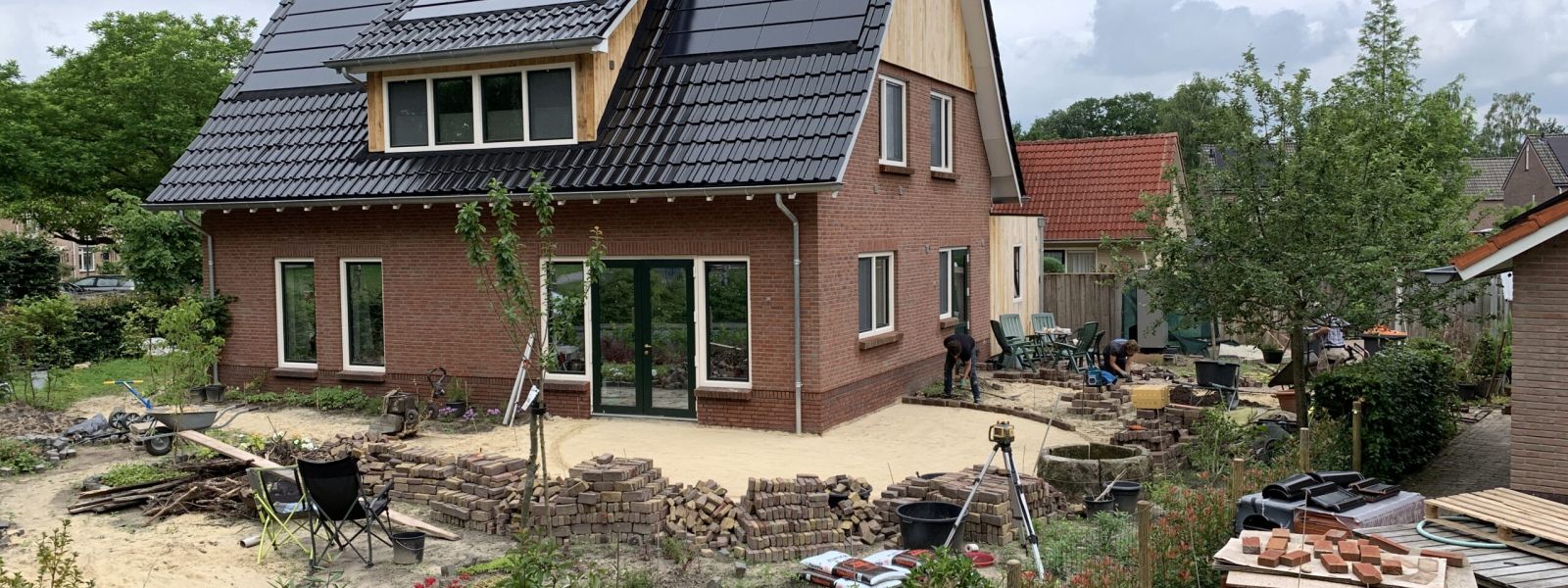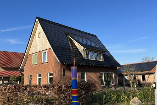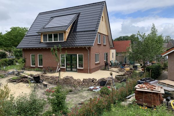 Vrijstaande nieuwbouwwoning, houtskeletbouw met houtvezel-isolatie. Extra focus op goede isolatie en ventilatie met wtw.Lucht-water warmtepomp voor de verwarming, in-dak zonnepanelen om stroom op te wekken