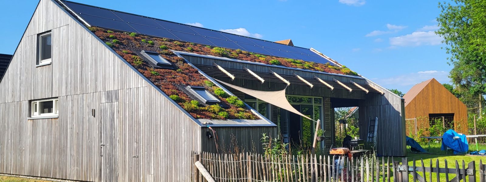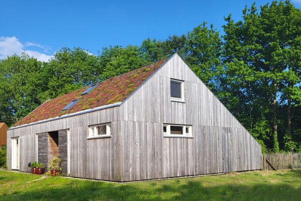 Een energieneutrale woning voorzien van warmtepomp en een sedum dak. De gevels zijn bekleed met duurzaam gemodificeerd populierenhout uit Schijndel e.o.