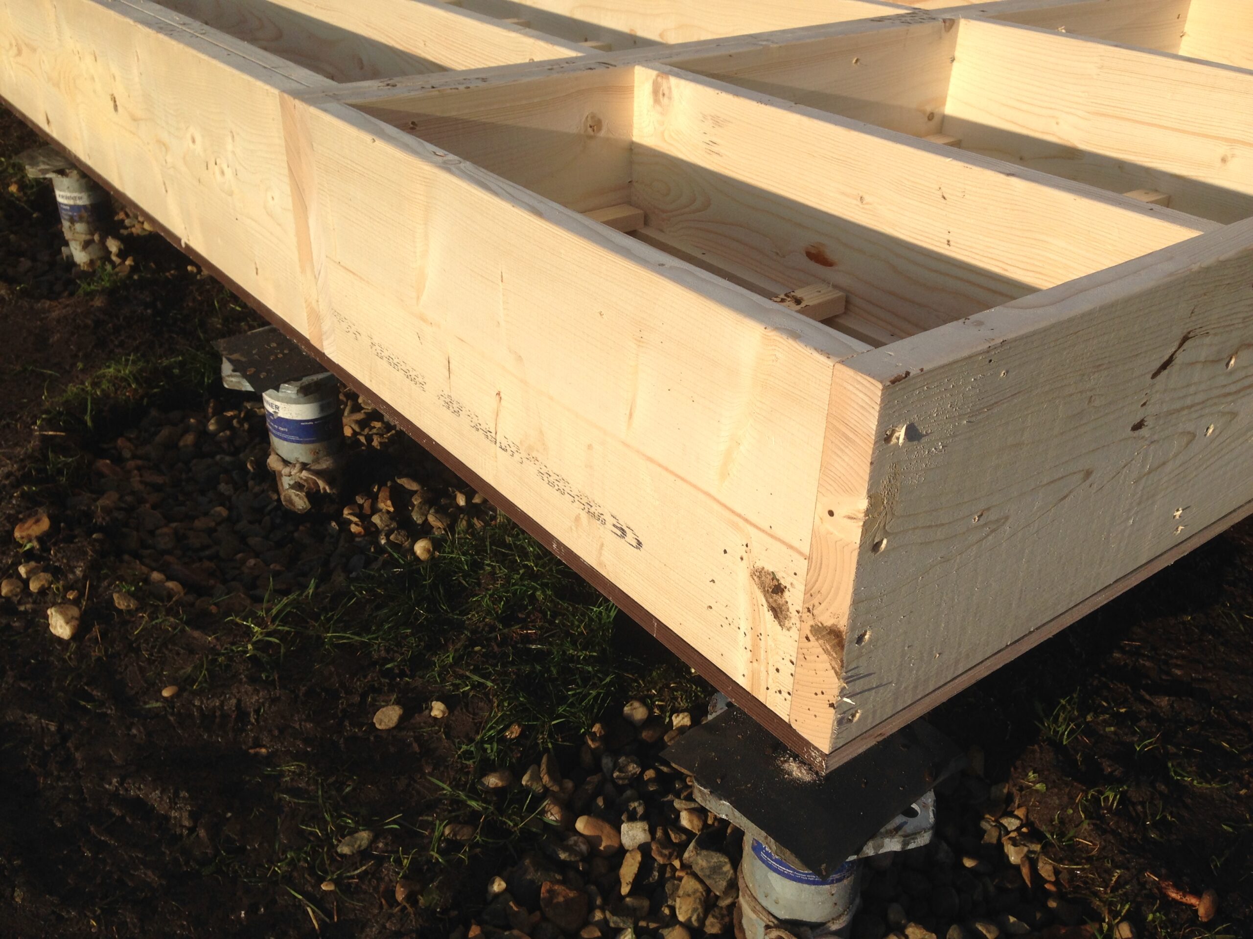 Toepassing houten vloerconstructie: zonder stalen constructie, vloer als één geheel, vraagt i.v.m. maximale overspanningen wel om extra schroefpalen, maar geeft stabielere vloer en positief voor beperken windgeluid onder de woning.