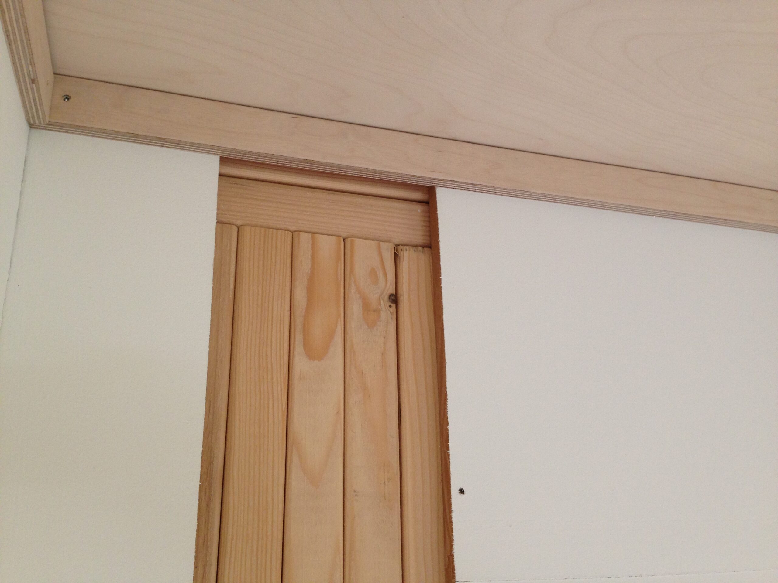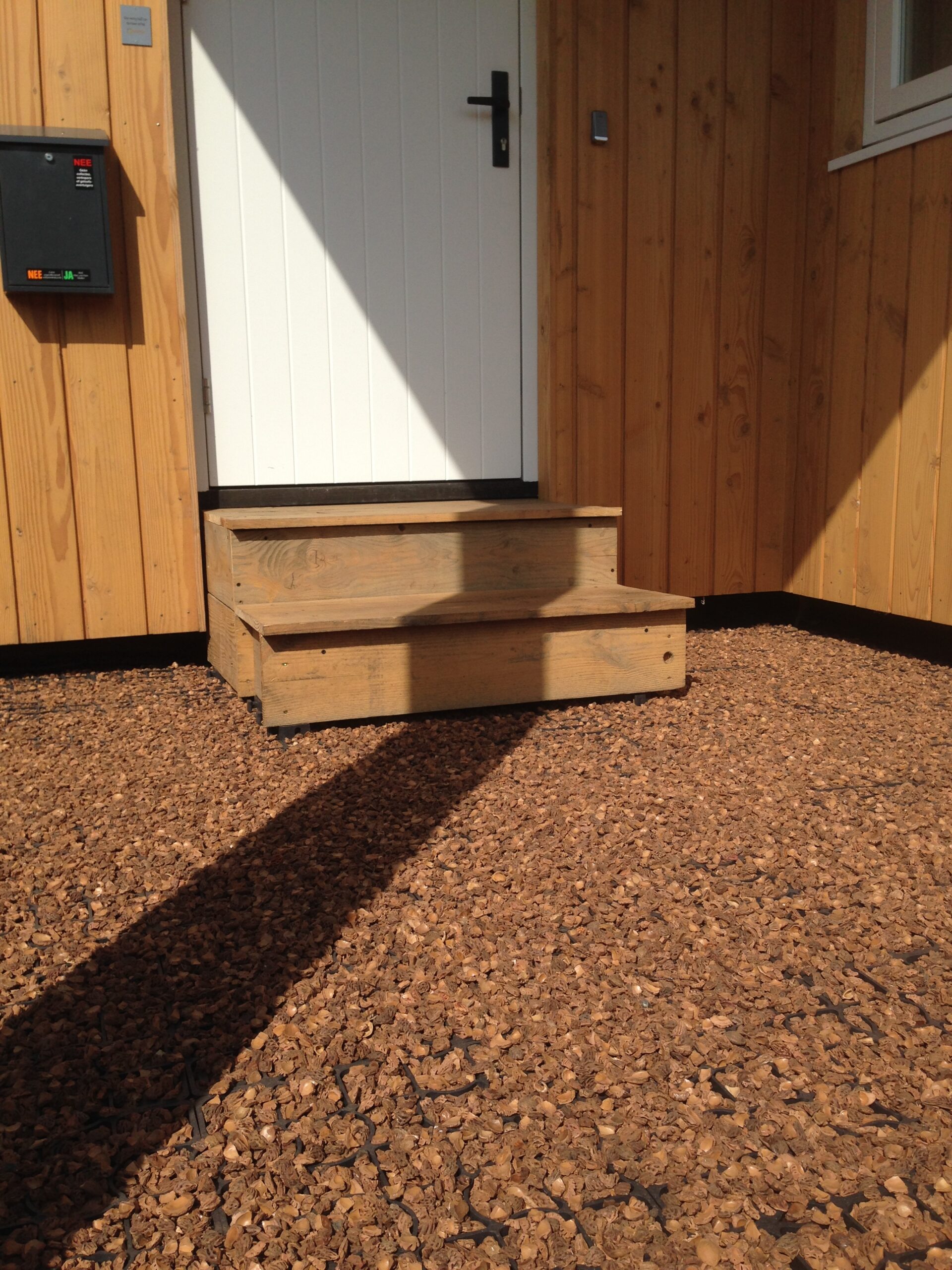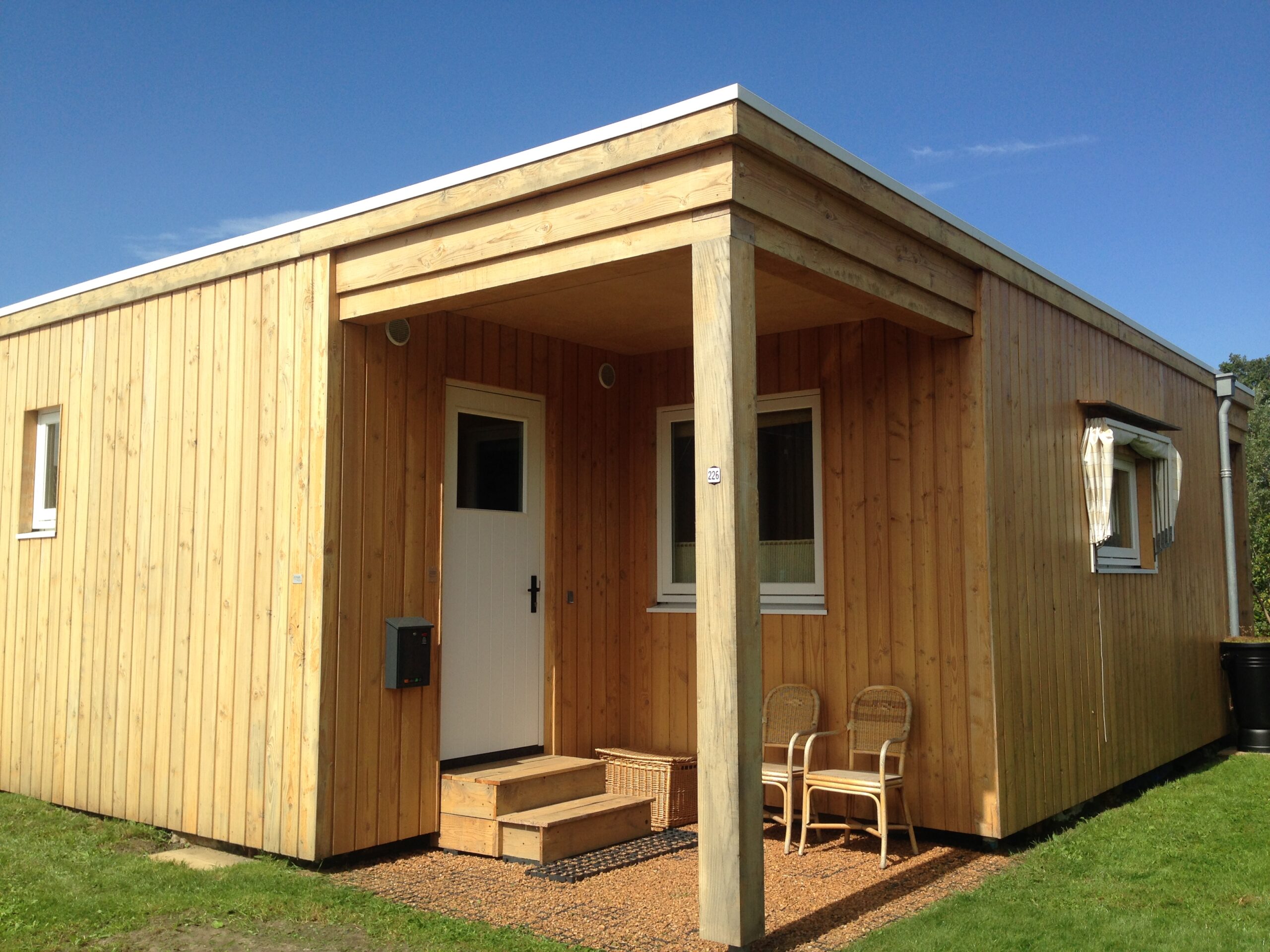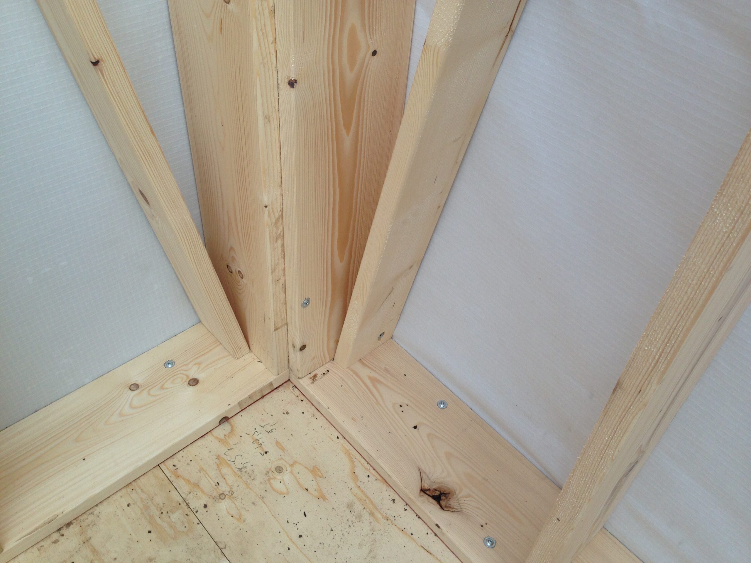 Binnenzijde afwerking: wanden Agepan beplating+leemverf, dak Berken multiplex, vloer Marmoleum Click.