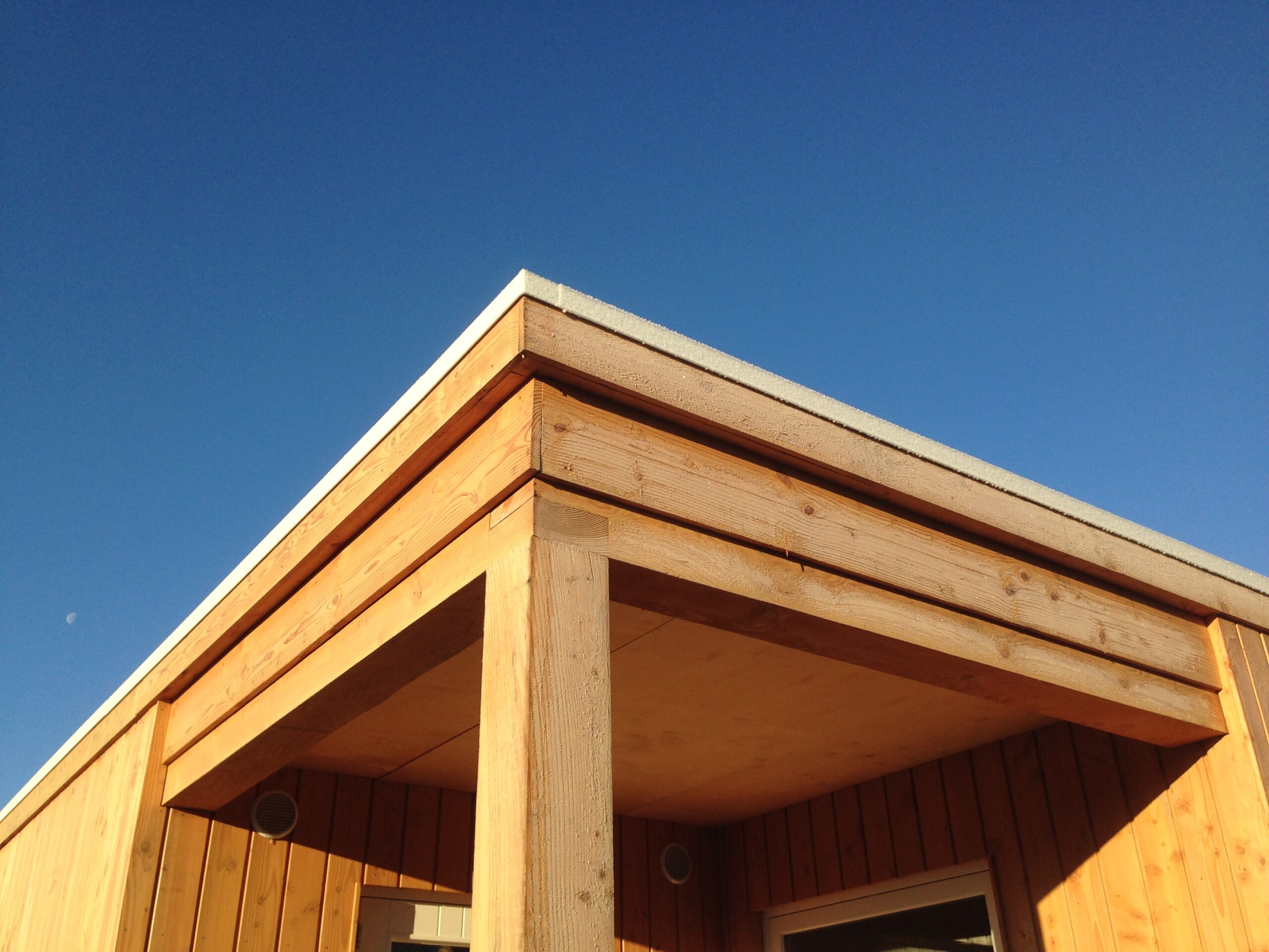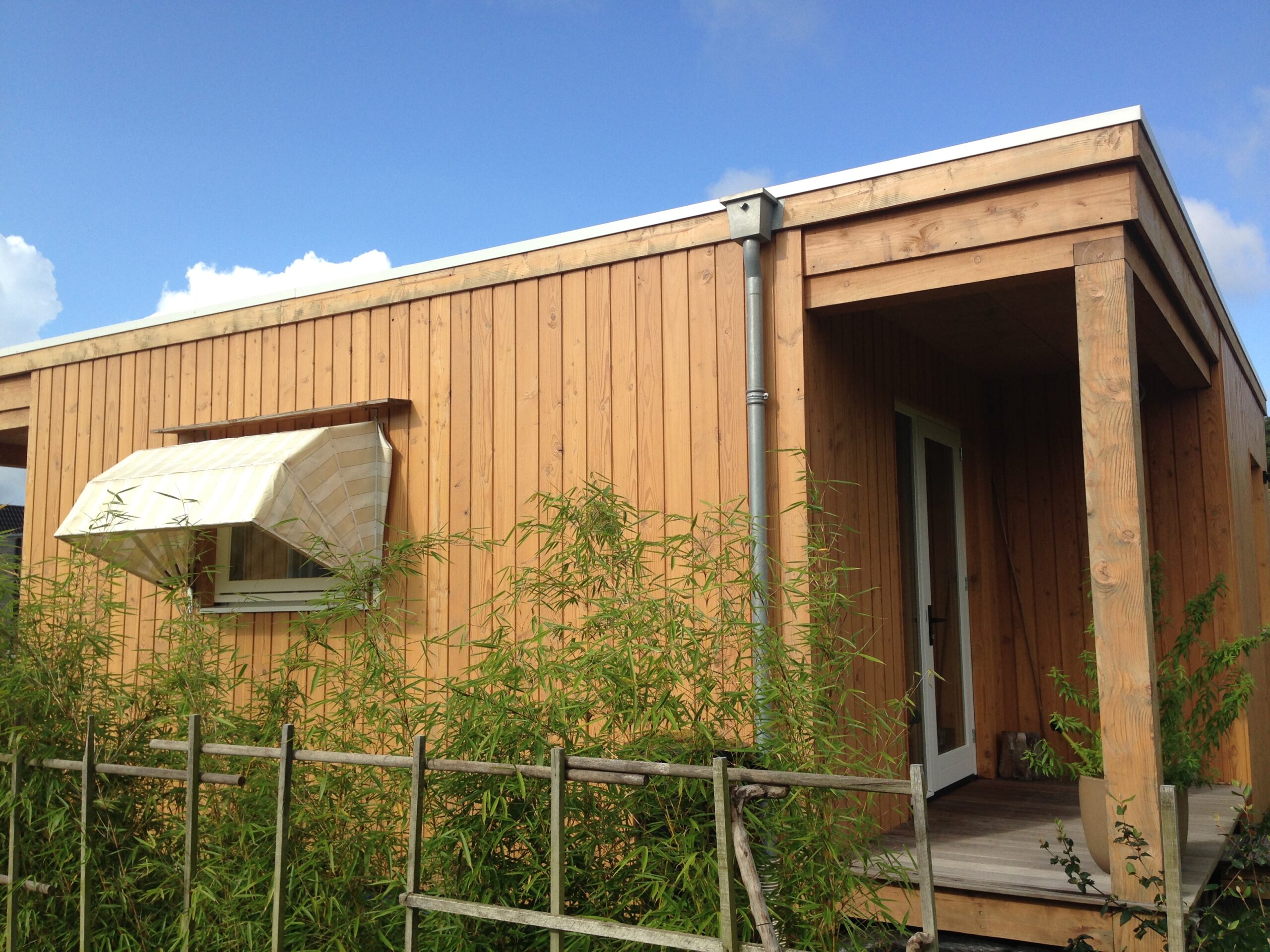 Compacte houten woning (57 m2). Prefab casco en zelf afgebouwd. Natuurlijke isolatie. Dampopen gevels. Gefundeerd op stalen schroefpalen. Ook de vloer constructie is van hout. Eigen ontwerp. Bouwprincipe eenvoud.
