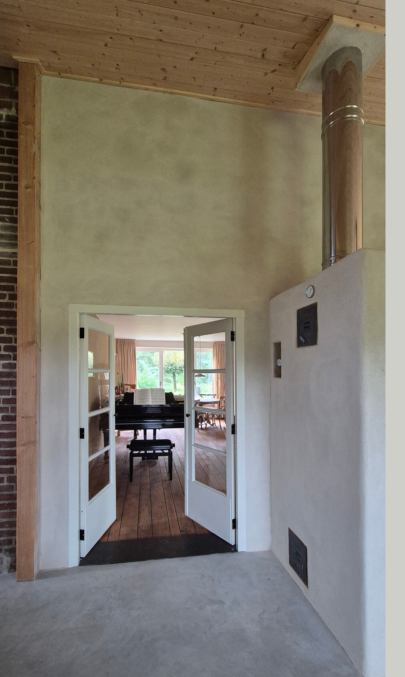 De nieuwe aanbouw heeft een weldadig binnenklimaat, met dampopen gevel- en dakopbouw, natuurlijke materialen. De gevels zijn aan de binnenzijde met leemstuc afgewerkt, waardoor de relatieve luchtvochtigheid en temperatuur heel stabiel zijn. Omdat er in de woonkamer van het bestaande huis een mooie eiken vloer lag hebben we hier wandverwarming toegepast. Dat bevalt ook erg goed. Advies is om te komen ervaren hoe dit allemaal aanvoelt.
