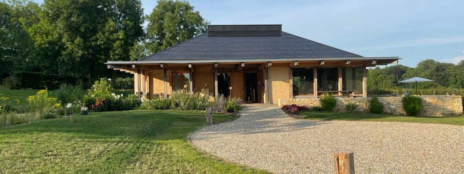 De drie bouwelementen zijn hout, leem en (biologisch)stro geworden.Ons woonhuis (220 m2) is ( omdat het in een waterrijk gebied ligt) gefundeerd door 360 houten palen in de grond die afgedekt zijn met een dikke laag glasschuim. Hierop is een eikenhouten frame opgezet dat ingevuld is geworden met strobalen van spelt. Het is van binnen en buiten afgewerkt met leem. Alle vloeren binnen zijn van leem. Energie halen we vanuit een aftakking van onze bron met een water-water warmtepomp . Deze warmt in de winter en koelt in de zomer. De ramen bestaan uit vacuümglas. We zijn afgeweken van een standaard dak met pannen en hebben gekozen voor een dakbedekking van geïntegreerde zonnepanelen glas/glas waardoor we helemaal energieneutraal zijn. Het dak hebben we geïsoleerd door het inblazen met het kaf van het stro dat diende voor de bouw. Wol voor de verdere isolatie . Binnenafwerking ( deuren, kasten, etc…) zijn getimmerd met het gedroogde hout van populieren die voorheen op het bouwterrein stonden. De terrassen rondom het huis zijn van van inlands gestoomd essenhout. De hoofdmaterialen hebben we zo dicht mogelijk in de buurt proberen te verwerven ( hout, leem ,stro ) . Het huis zien wij als een fantastisch familieproject omdat we zó dicht bij de bron zaten van het hele gebeuren. Onze zoon zorgde voor het bouwontwerp en de (ecologische) bouwmaterialen en samen met zijn broers en de jongens van zijn bouwbedrijf bouwden ze dit geweldige huis .