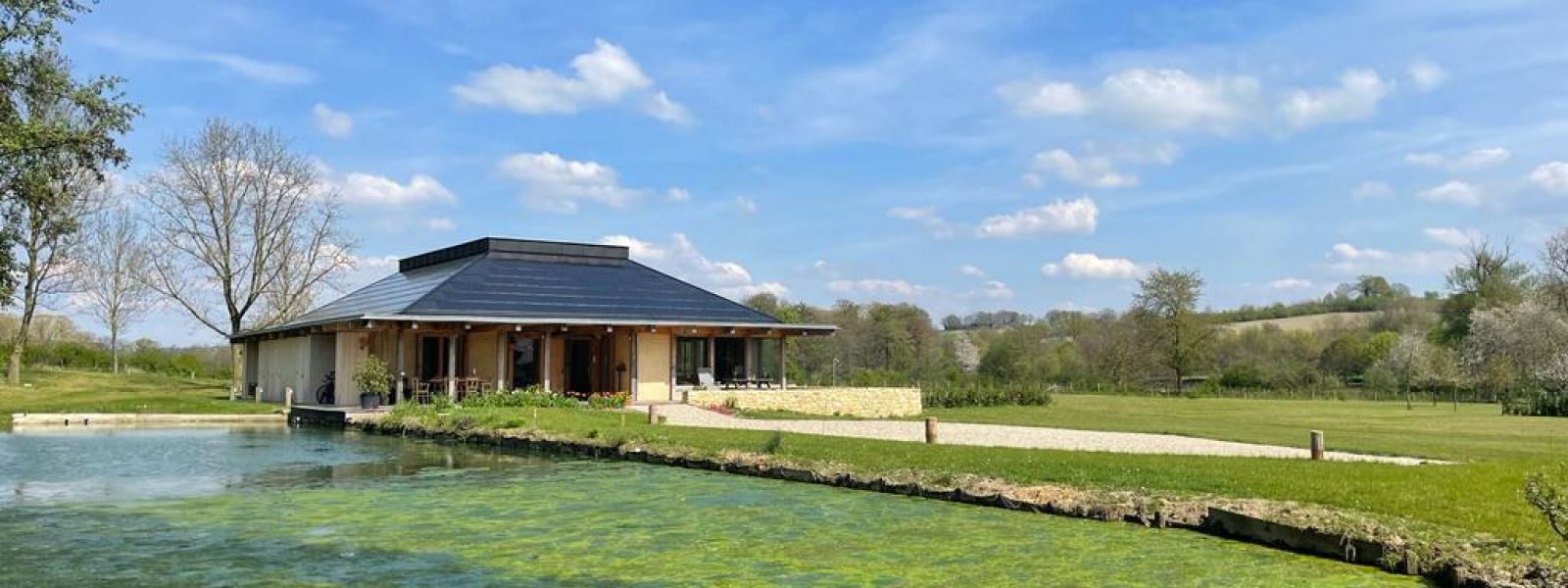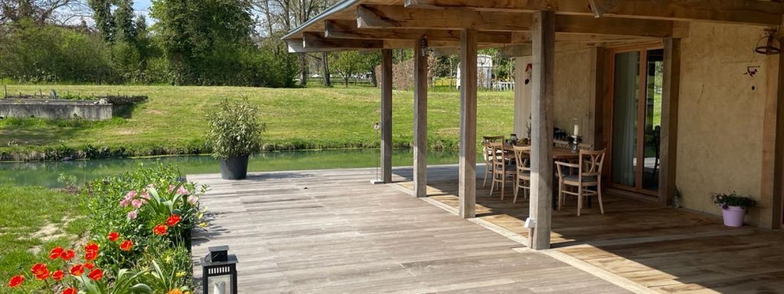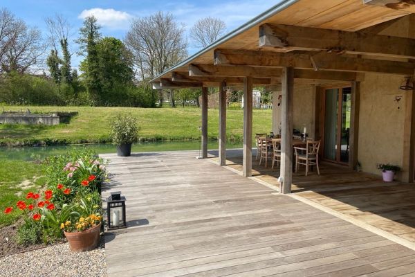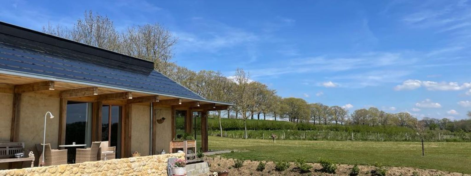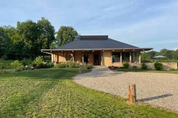 De drie bouwelementen zijn hout, leem en (biologisch)stro geworden.Ons woonhuis (220 m2) is ( omdat het in een waterrijk gebied ligt) gefundeerd door 360 houten palen in de grond die afgedekt zijn met een dikke laag glasschuim. Hierop is een eikenhouten frame opgezet dat ingevuld is geworden met strobalen van spelt. Het is van binnen en buiten afgewerkt met leem. Alle vloeren binnen zijn van leem. Energie halen we vanuit een aftakking van onze bron met een water-water warmtepomp . Deze warmt in de winter en koelt in de zomer. De ramen bestaan uit vacuümglas. We zijn afgeweken van een standaard dak met pannen en hebben gekozen voor een dakbedekking van geïntegreerde zonnepanelen glas/glas waardoor we helemaal energieneutraal zijn. Het dak hebben we geïsoleerd door het inblazen met het kaf van het stro dat diende voor de bouw. Wol voor de verdere isolatie . Binnenafwerking ( deuren, kasten, etc…) zijn getimmerd met het gedroogde hout van populieren die voorheen op het bouwterrein stonden. De terrassen rondom het huis zijn van van inlands gestoomd essenhout. De hoofdmaterialen hebben we zo dicht mogelijk in de buurt proberen te verwerven ( hout, leem ,stro ) . Het huis zien wij als een fantastisch familieproject omdat we zó dicht bij de bron zaten van het hele gebeuren. Onze zoon zorgde voor het bouwontwerp en de (ecologische) bouwmaterialen en samen met zijn broers en de jongens van zijn bouwbedrijf bouwden ze dit geweldige huis .
