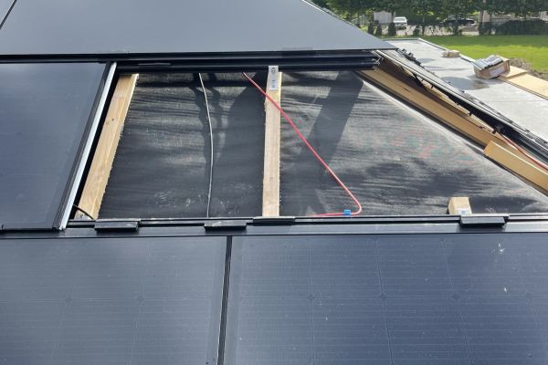 Zonnepanelen:aaneengesloten zonnedak 229 m2.Dakgeïntegrred bestaande uit 281 cellen DMEGC-96LS. van 842x672x6 mm