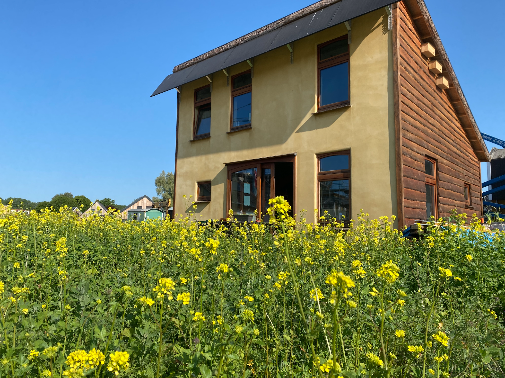 De basis van Sarahs woning werd geoogst bij een lokale boer: stro. Sarah werkte samen met StroBox, een bedrijf dat houten boxen maakt gevuld met samengeperst stro. ‘Je kunt de boxen zien als hele grote bakstenen waarmee je je huis opbouwt,’ vertelt Sarah. ‘Samen vormen ze het houtskelet én de isolatie ineen. Stro heeft als voordeel dat het een hoge isolatiewaarde heeft en toch ademt. Daarnaast nemen het hout en stro tijdens hun groei CO2 op, in tegenstelling tot niet-natuurlijke bouwmaterialen die tijdens het productieproces juist CO2 uitstoten. De opgeslagen CO2 blijft straks vastzitten in mijn woning.’