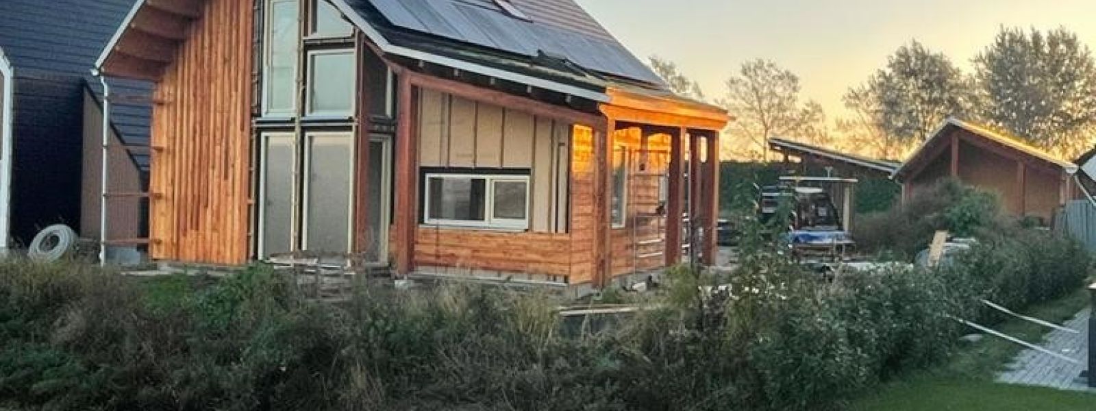 Het compacte huis van IJsbrand en Annet is net opgeleverd. We wonen er nog maar net en zijn nog bezig met de inbouw van de oude keuken. Veranda en productietuin komt dit voorjaar. Prefab houtskeletbouw van gebruikt hout en zoveel mogelijk natuurlijke en lokale materialen(bv FSC hout en Finti kozijnen). Gevelafwerking met optimaal verzaagd hout uit het Kuinderbos, we verwerken de hele stam. Regenwatercircuit en recirculatiedouches om water te besparen. Gras/turfdak voor regenwaterbuffering. Benedenverdieping rolstoeltoegankelijk.