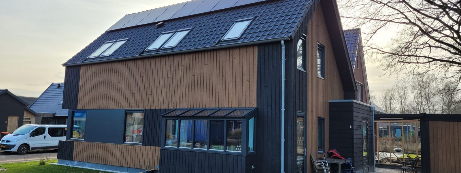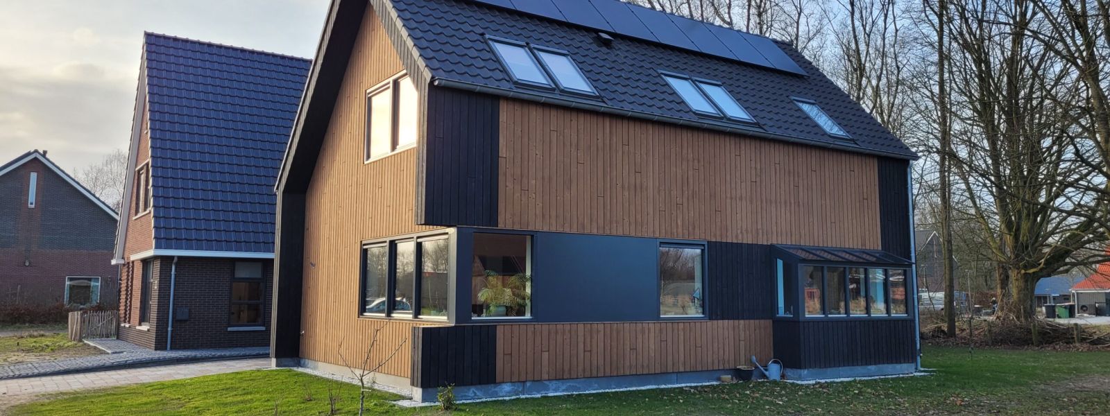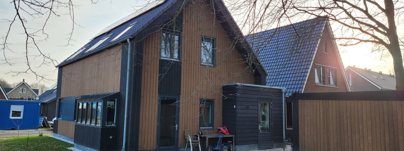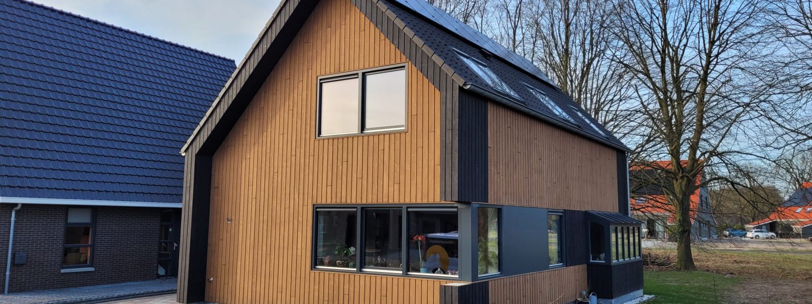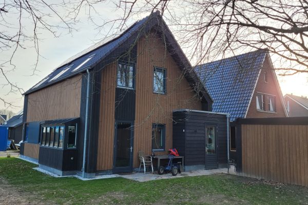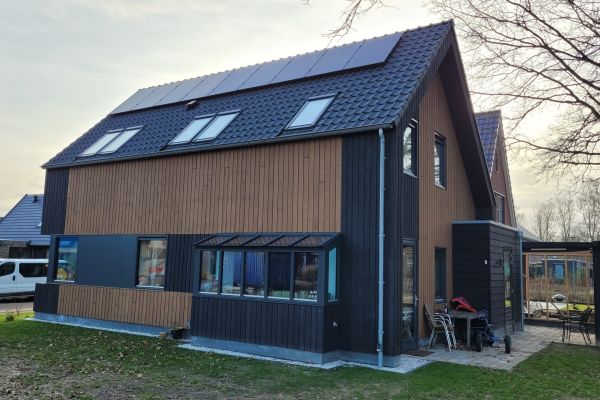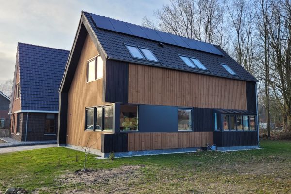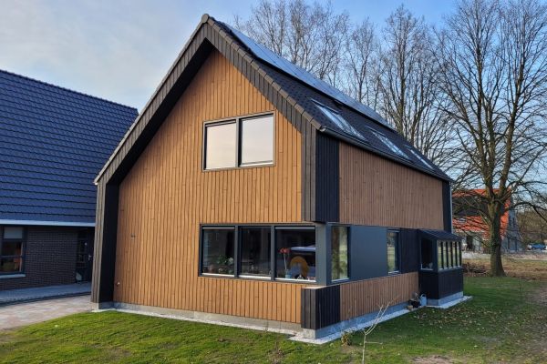 Vrijstaande houtskeletbouw woning, met houten gevelbekleding en houtvezelisolatie.