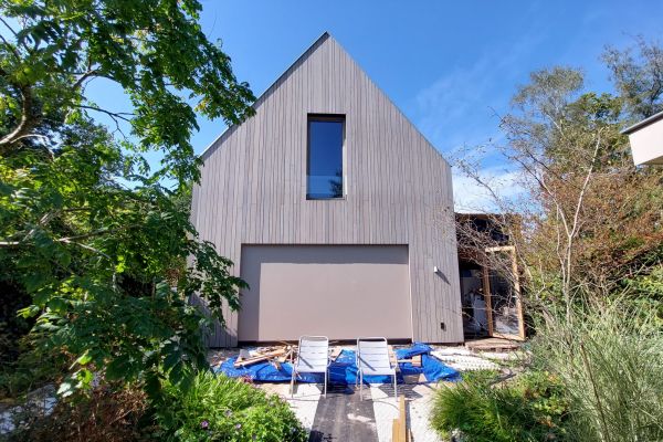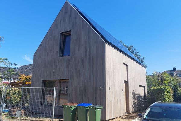 Houten woning uit 2024, samengesteld met behulp van CLT-platen (cross-laminaten -timber, ofwel drielaags kruislings verlijmd vurenhout) en CNC freestechniek waardoor blinde verbindingen gemaakt konden worden. Isolatie met houtvezel. Een dampopen systeem zonder folie.