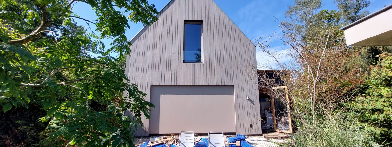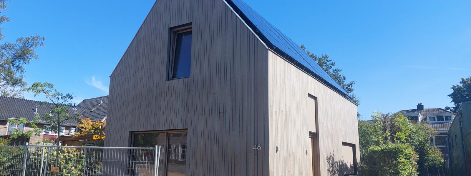 De gevelbekleding is van voorvergrijsd fraké, een houtsoort die verduurzaamd is door thermische modificatie.
