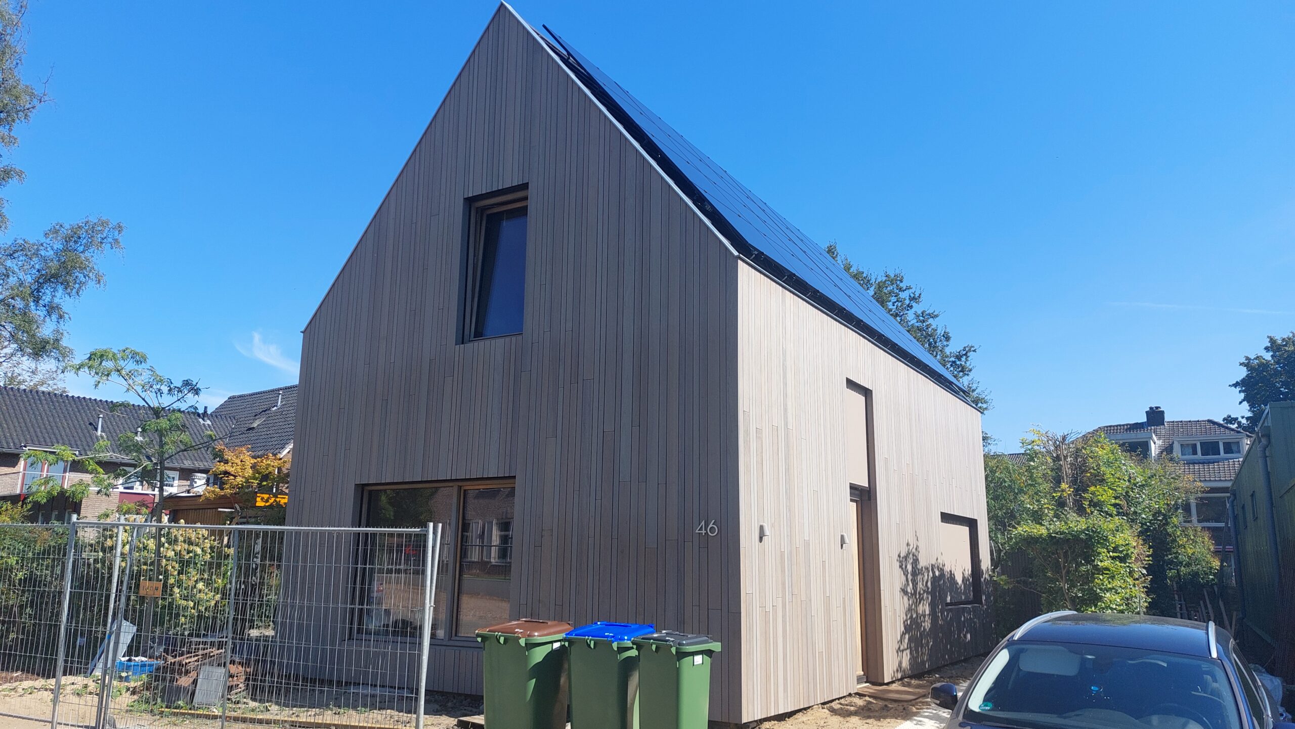 Houten woning uit 2024, samengesteld met behulp van CLT-platen (cross-laminaten -timber, ofwel drielaags kruislings verlijmd vurenhout) en CNC freestechniek waardoor blinde verbindingen gemaakt konden worden. Isolatie met houtvezel. Een dampopen systeem zonder folie.